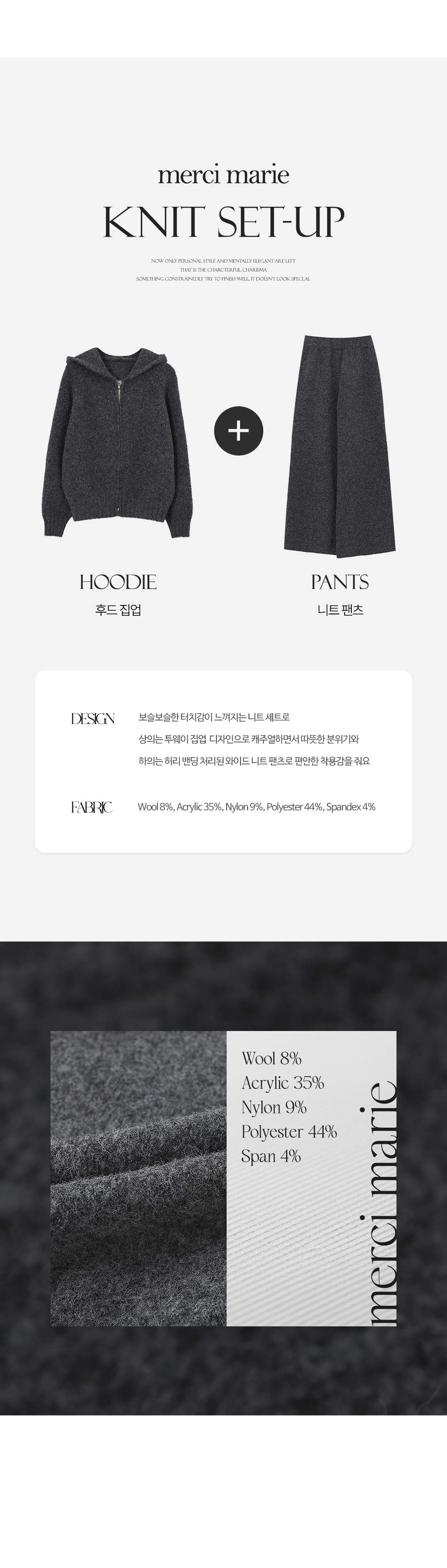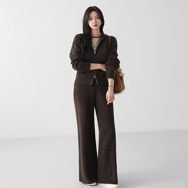 - 하의는 허리 밴딩 처리된 와이드 니트 팬츠로 편안한 착용감을 줌