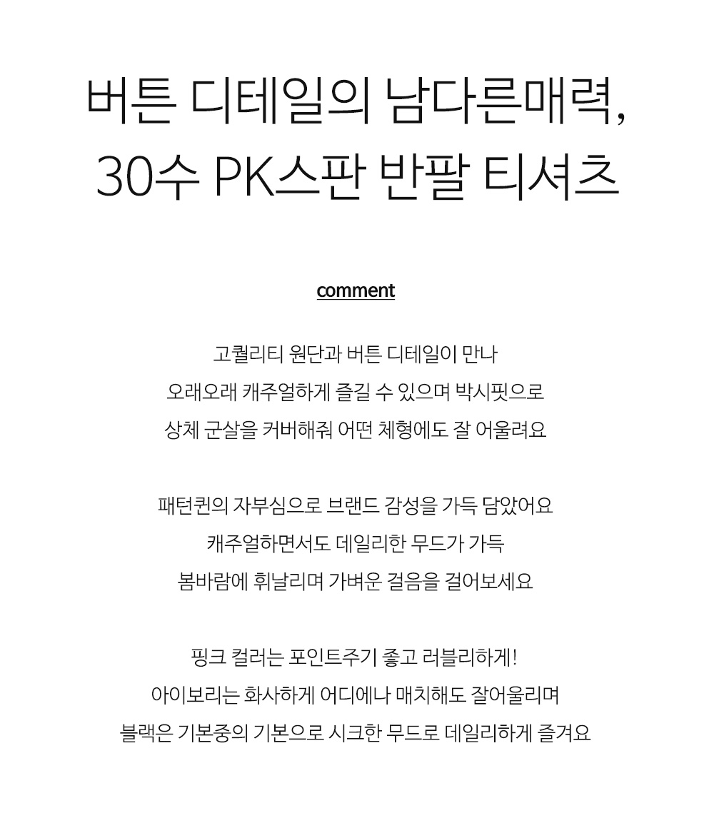 30수 PK스판지로 제작되어 세탁 후에도 변형 걱정 없이 오래오래 입을 수 있답니다 :)