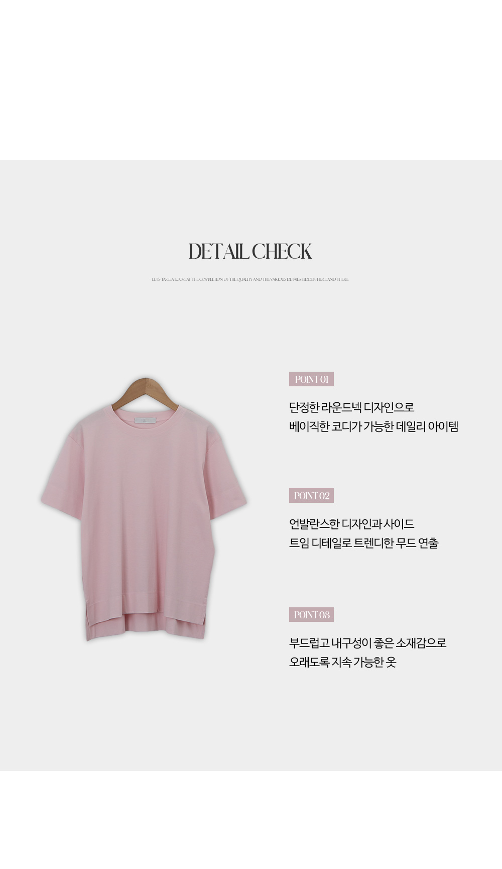 - 라운드넥 디자인으로 누구나 편하게 착용 가능하며, 탄탄한 넥 라인으로 늘어짐 방지