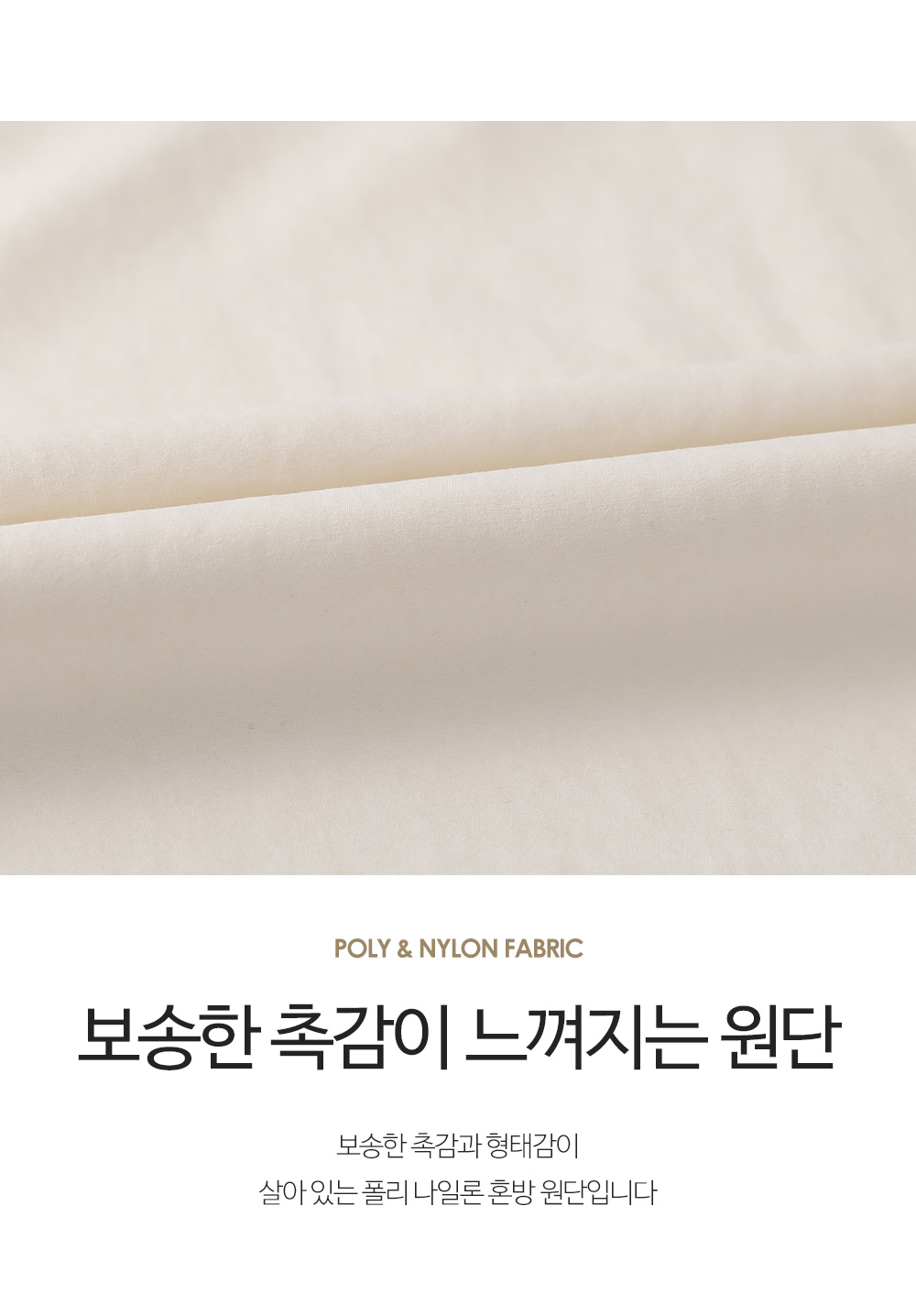 - 광택이 아주 은은하게 돌고, 보송한 촉감과 형태감이 살아 있는 폴리 나일론 혼방 원단