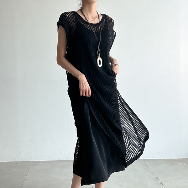 자체제작/ 그물망 옆트임 롱 원피스 #38547