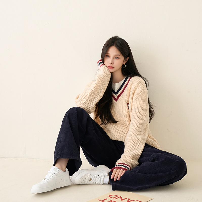 자체제작/ 배색 자수 브이넥 니트 #111675