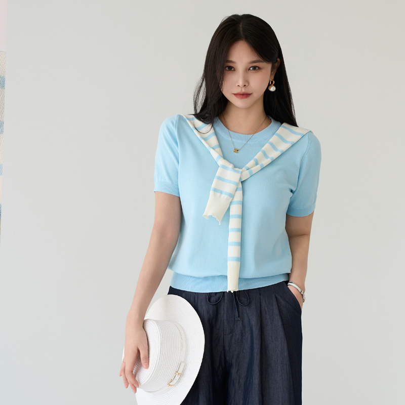 - 반팔 니트와 스트라이프 숄 세트 구성