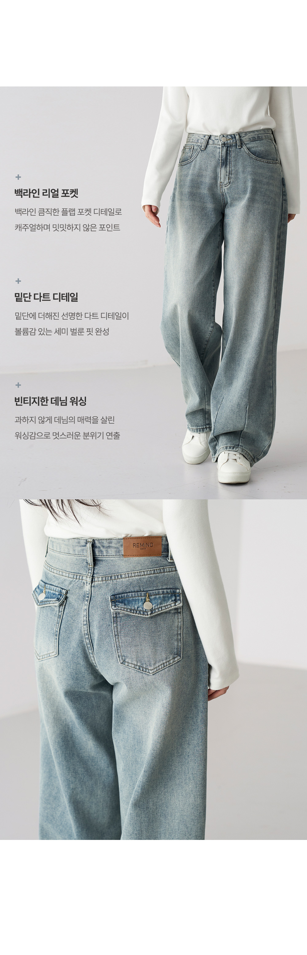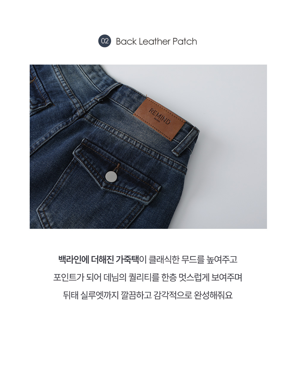 - 백라인 포켓 버튼 디테일이 더해져 힙업 효과가 있으며 뒷모습까지 멋스러움
