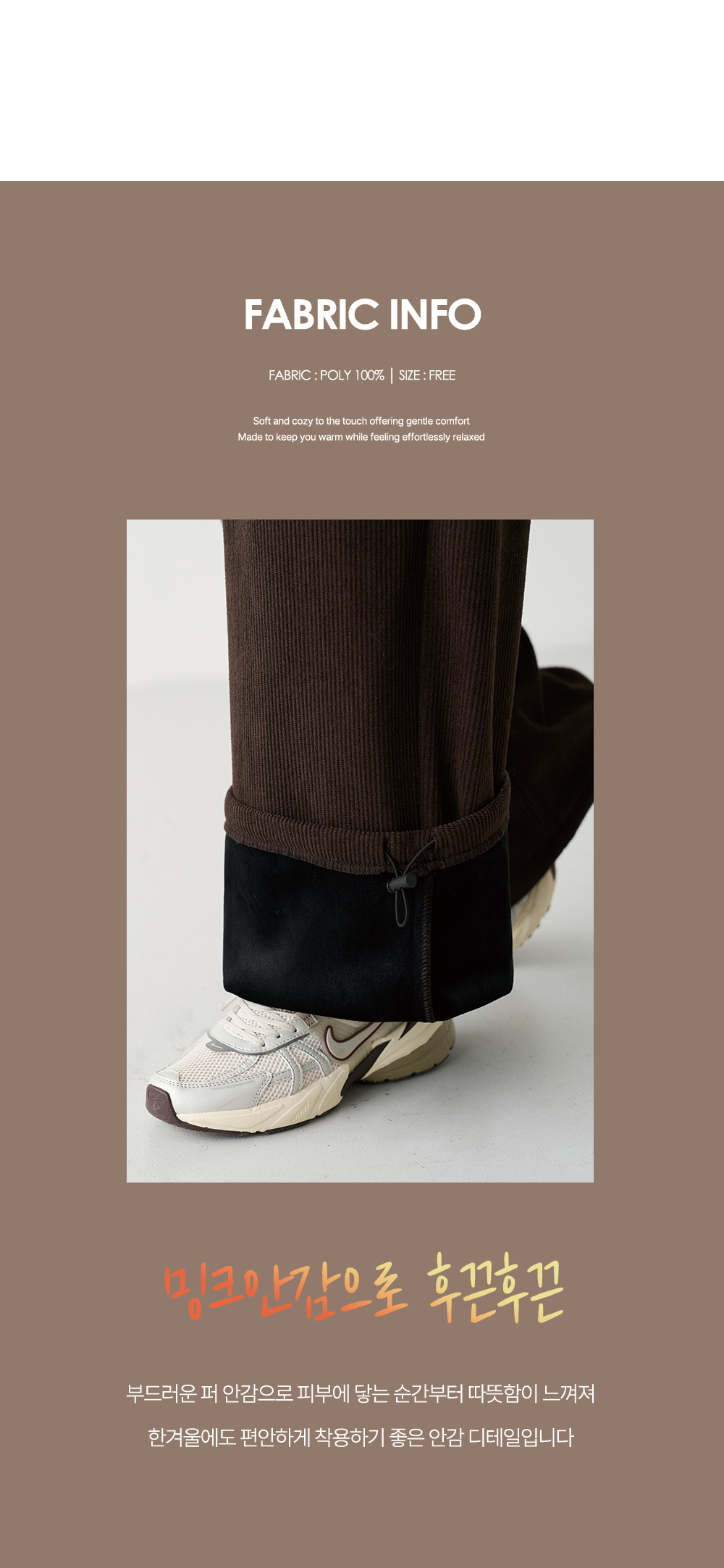 - 부드럽고 톡톡한 밍크 기모 안감이 더해져 외부의 차가운 공기를 차단