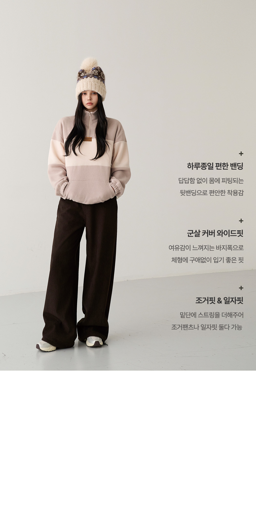 - 밑단 스트링 디테일이 더해져 와이드한 일자핏 & 조거핏 2가지 스타일로 착용 가능