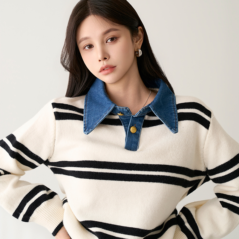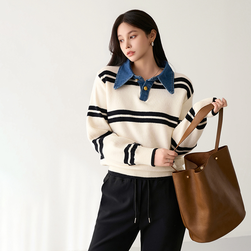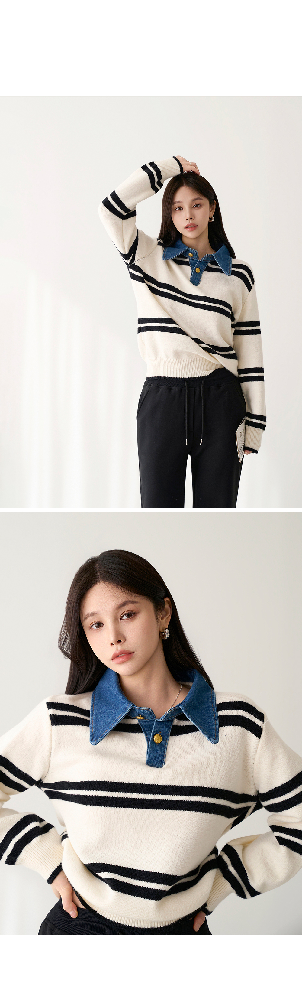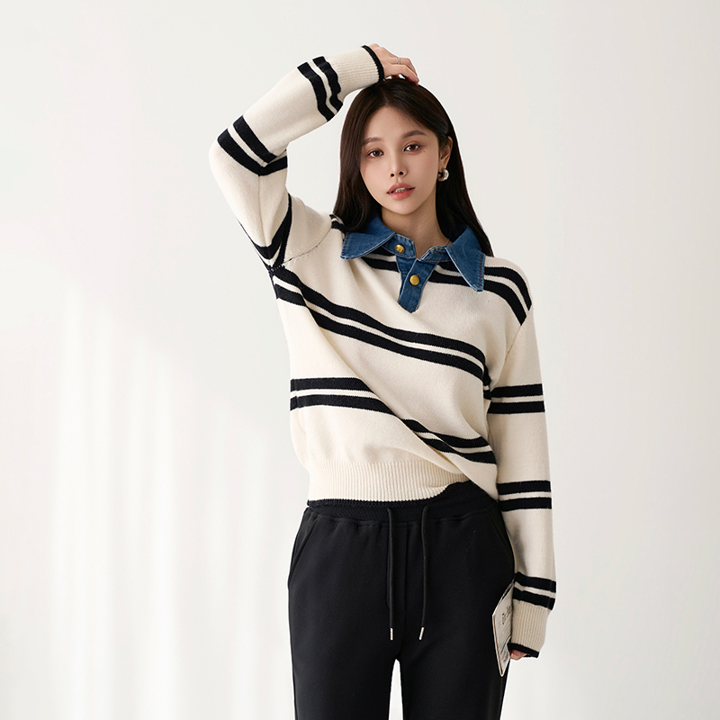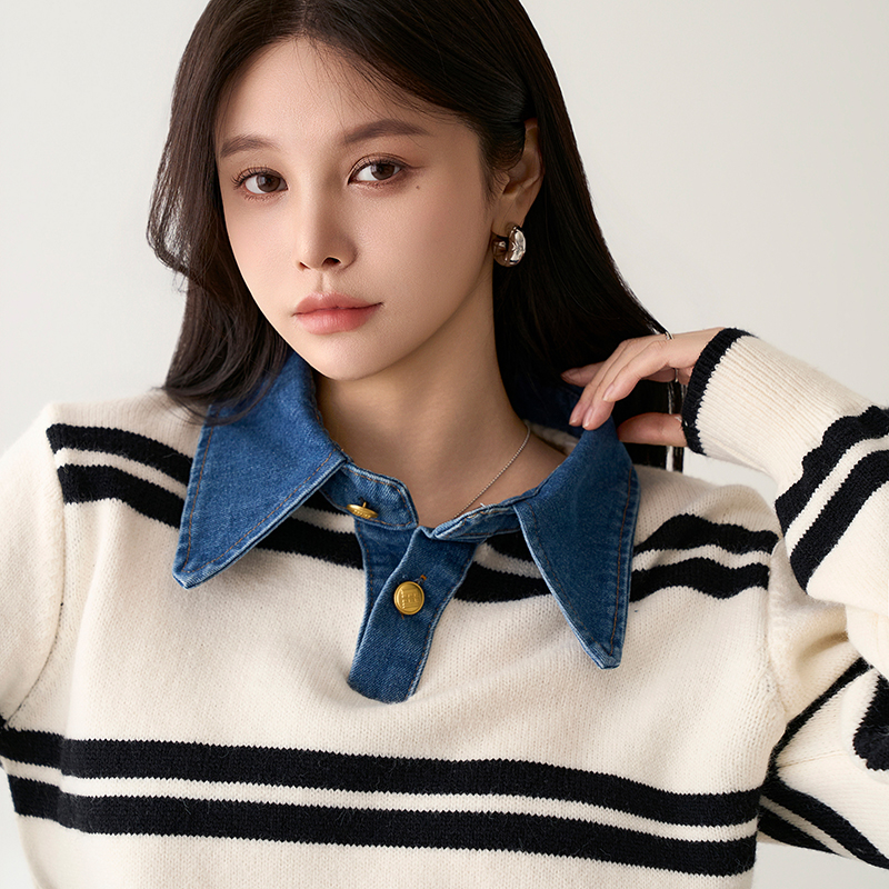 - 유니크한 데님 카라넥이 돋보이는 니트