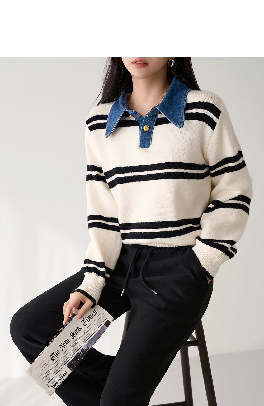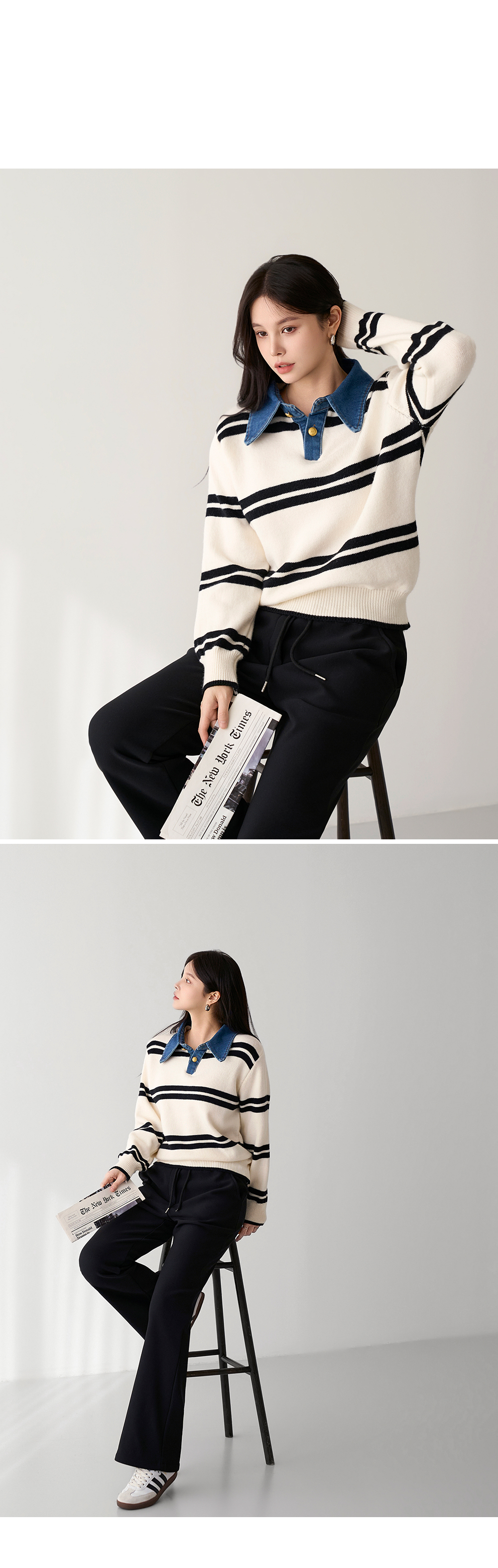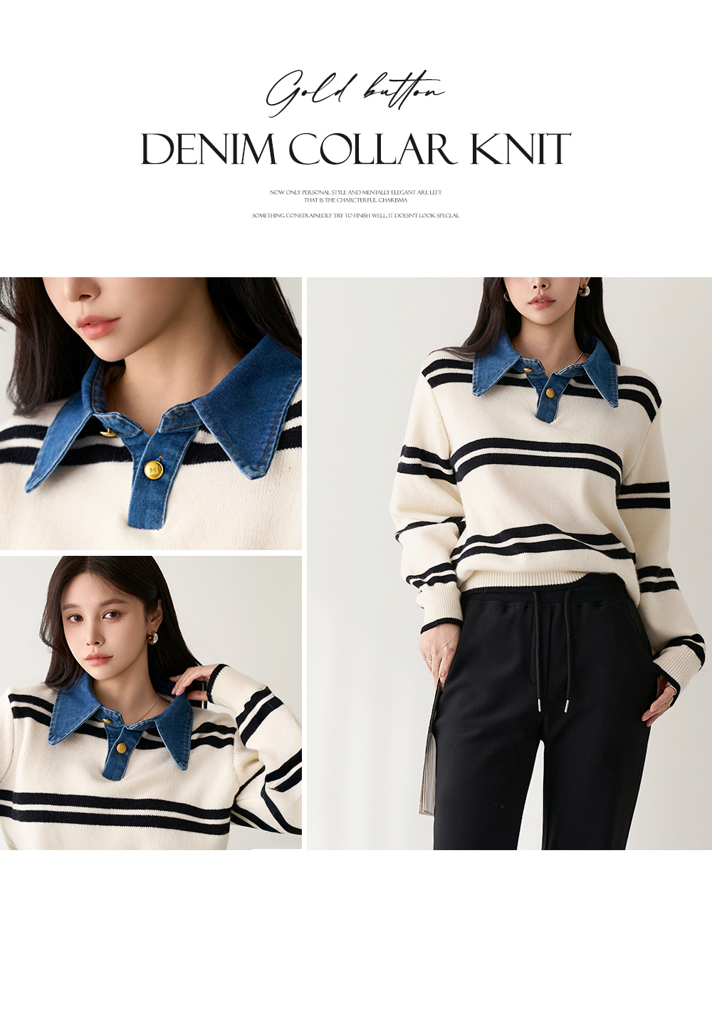 - 유니크한 데님 카라넥이 돋보이는 니트