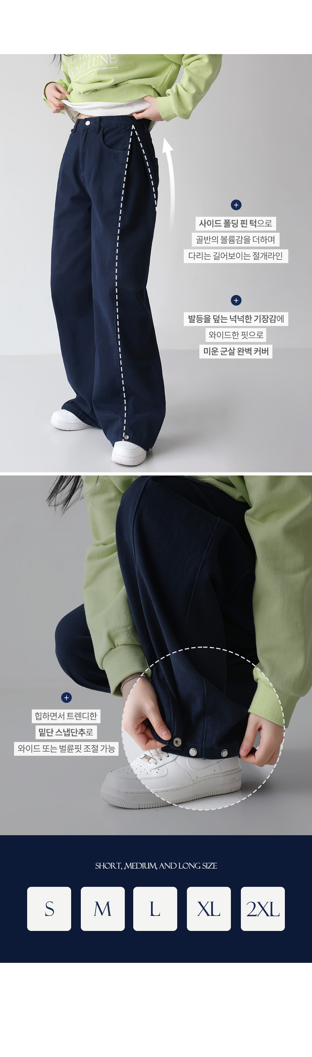 - 밑단의 스냅 버튼으로 와이드 or 벌룬 핏 투웨이 스타일링 가능