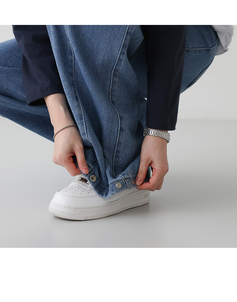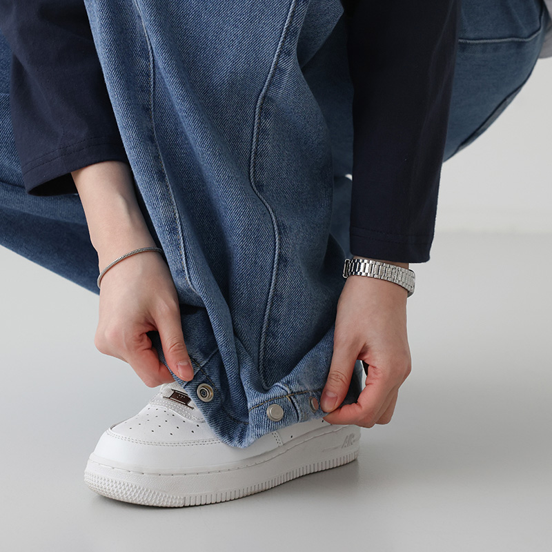 - 사이드 폴딩 핀턱과 밑단 스냅 단추 디테일