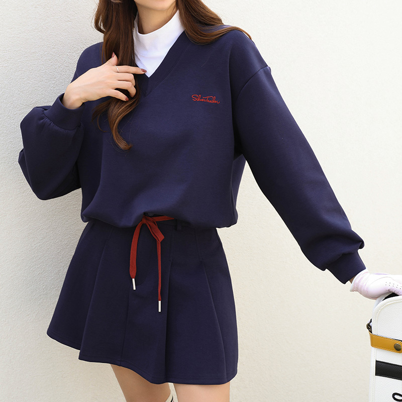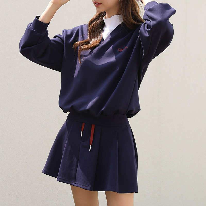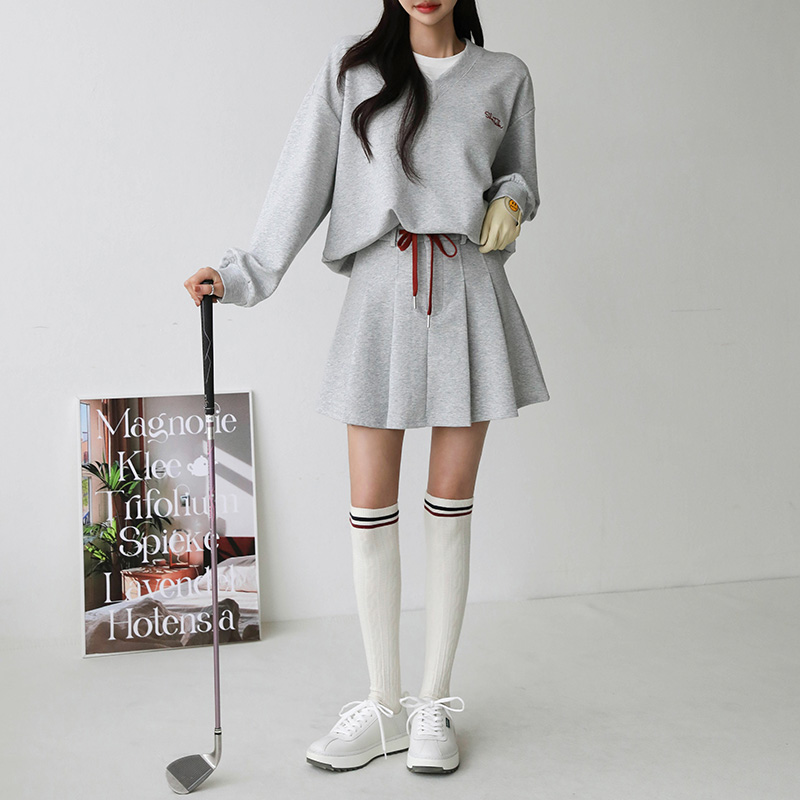 브이넥맨투맨과 플리츠스커트의 조화로운 디자인이 포인트!