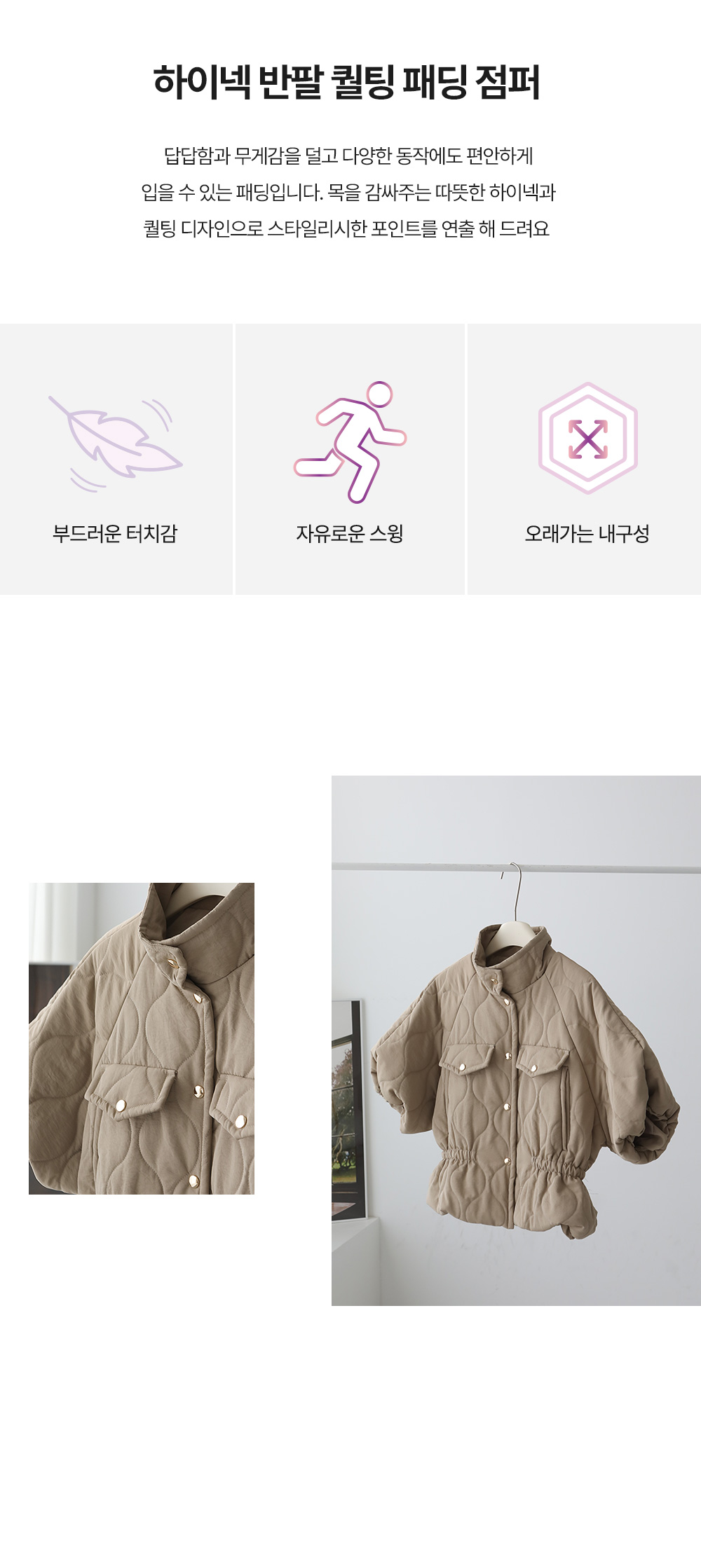 - 목을 따뜻하게 감싸주는 하이넥 디자인