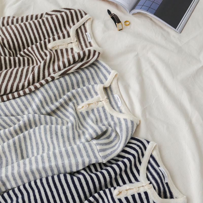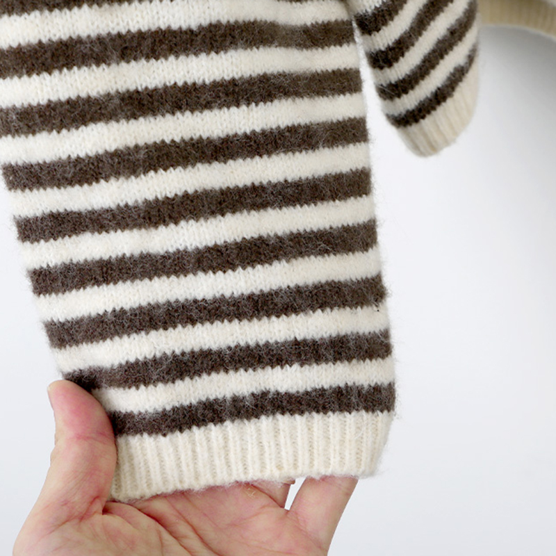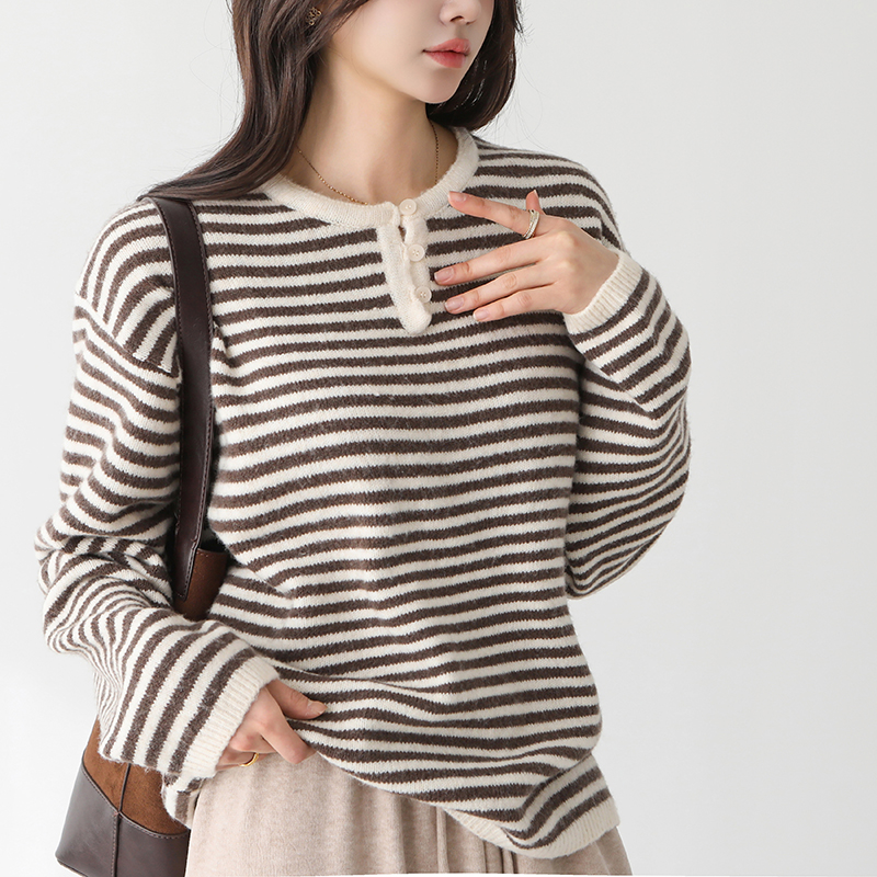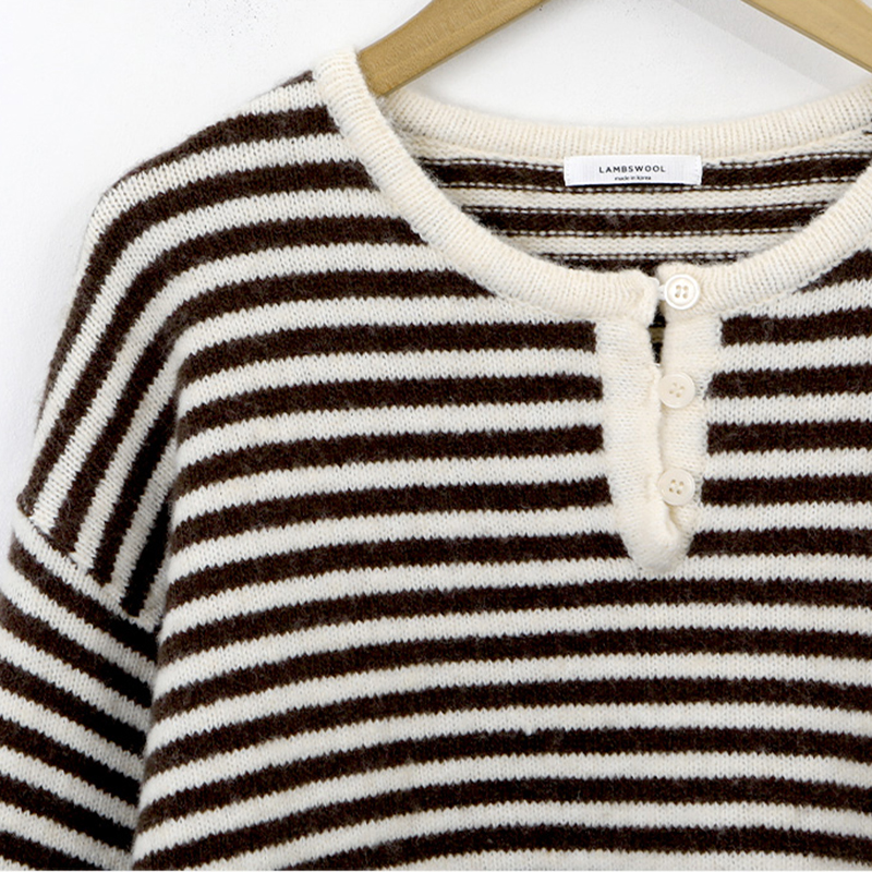 - 차분한 스트라이프 패턴으로 데일리하게 착용하기 좋은 니트