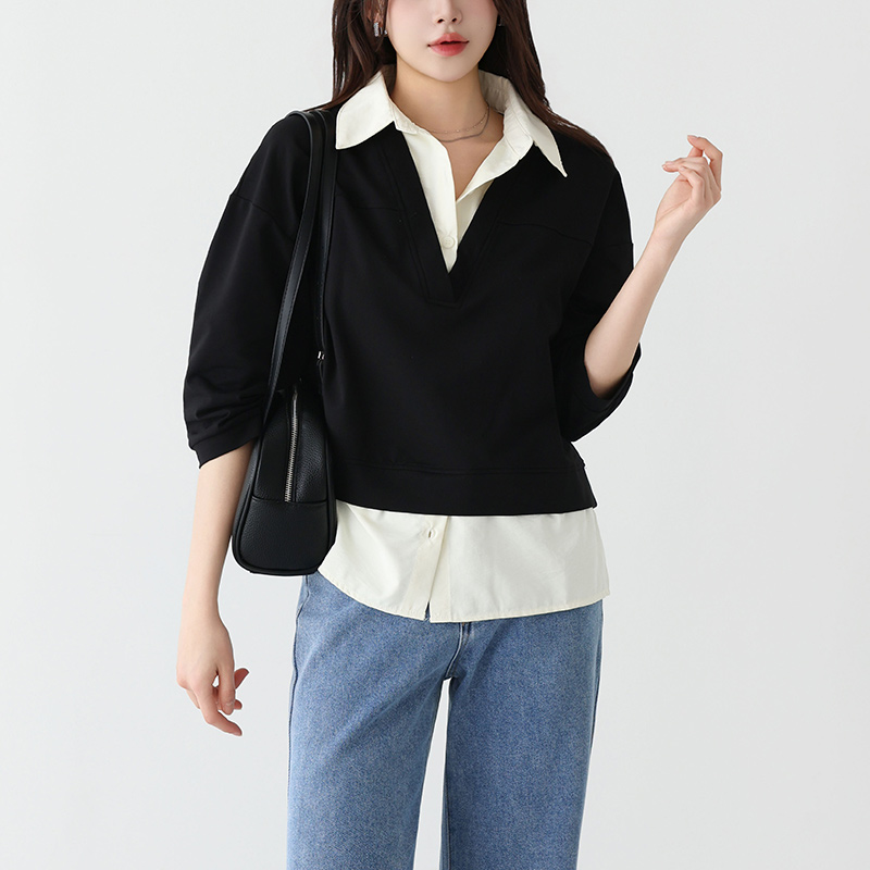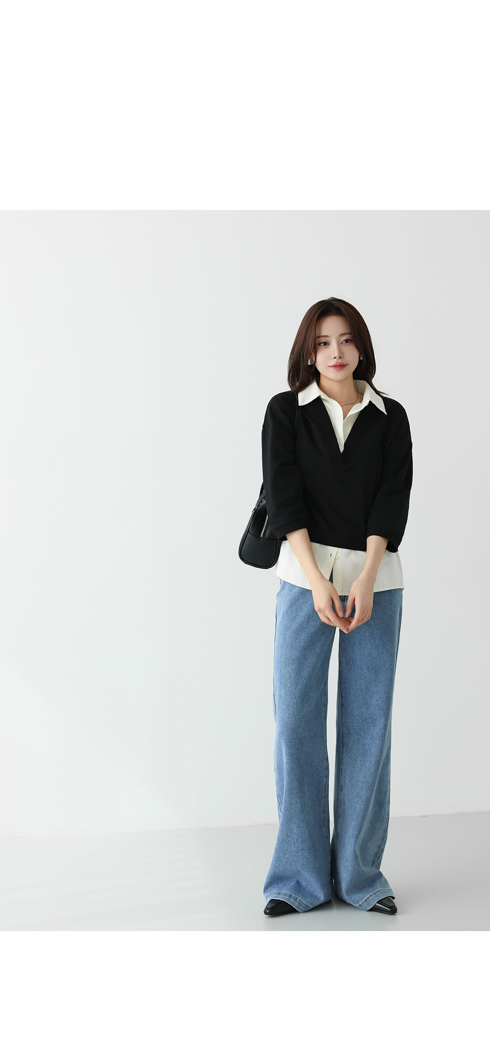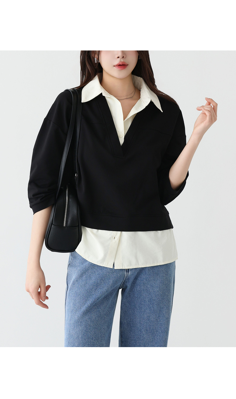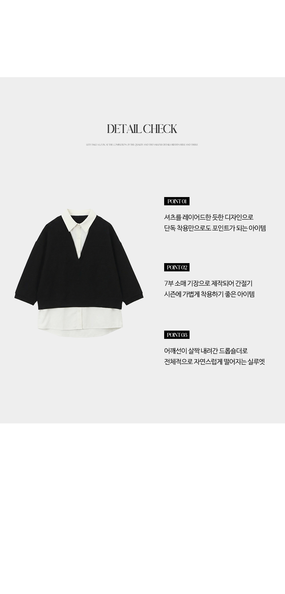 - 셔츠를 레이어드한 듯한 카라 배색 디테일을 더해 단독 착용만으로도 포인트가 되는 아이템