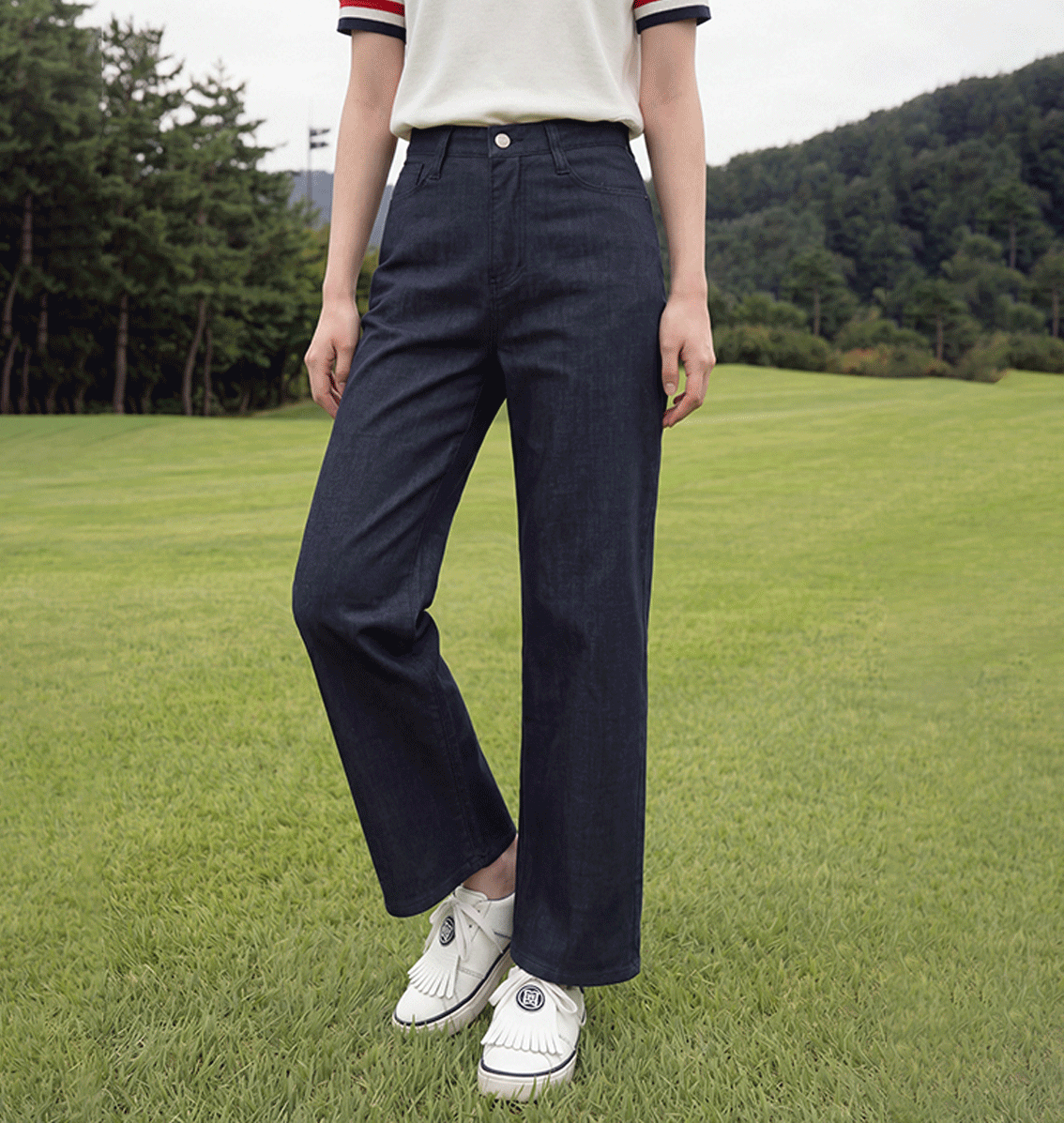 탄탄한 짜임과 세미 크롭 기장으로 깔끔한 핏