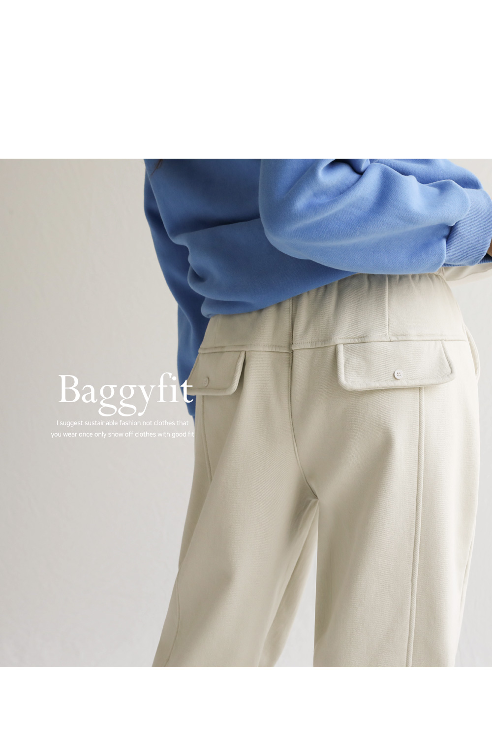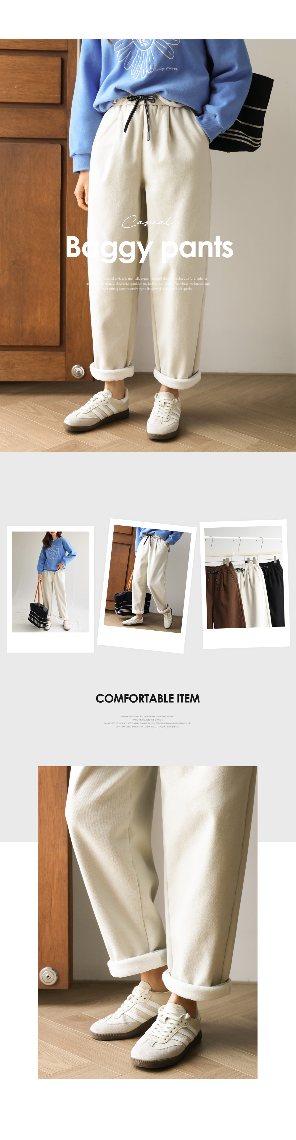 기존 배기팬츠의 답답함을 덜어내고자 허리밴딩과 조임끈을 추가했죠