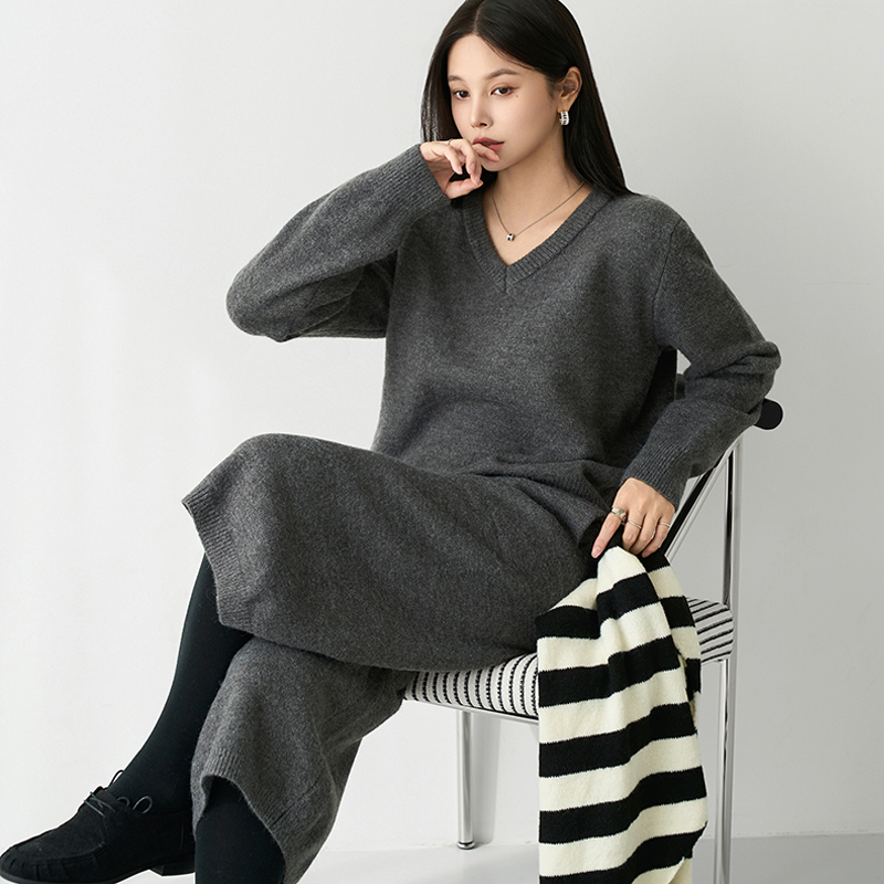 브이넥 니트 & 8부 와이드 팬츠 세트 #96409