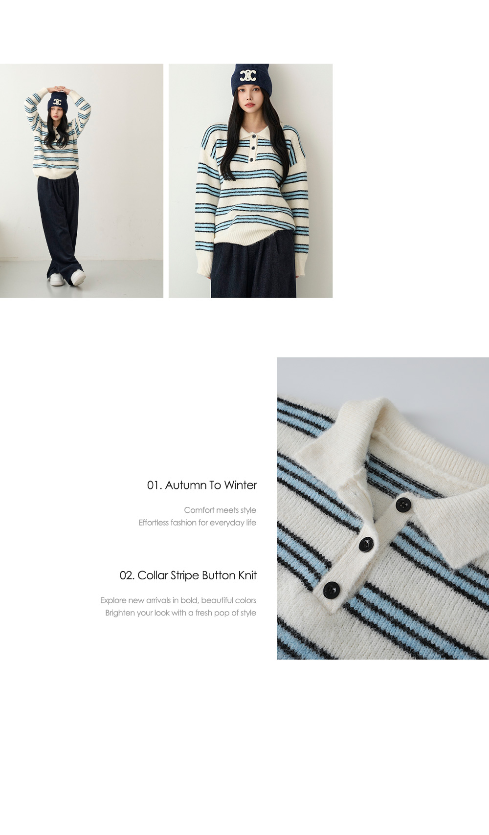 - 보송한 터치감의 니트 원사로 포근하게 착용 가능한 카라 니트