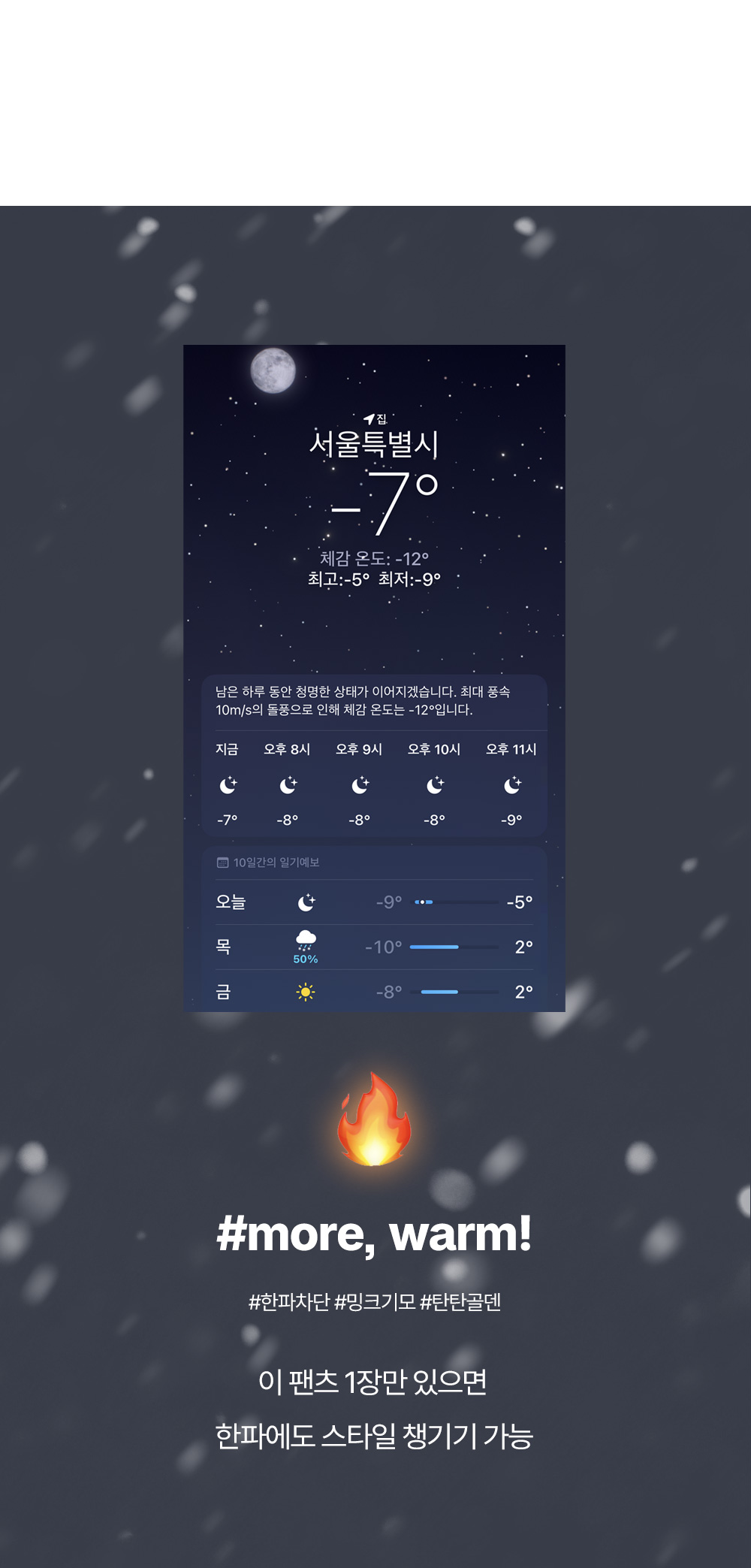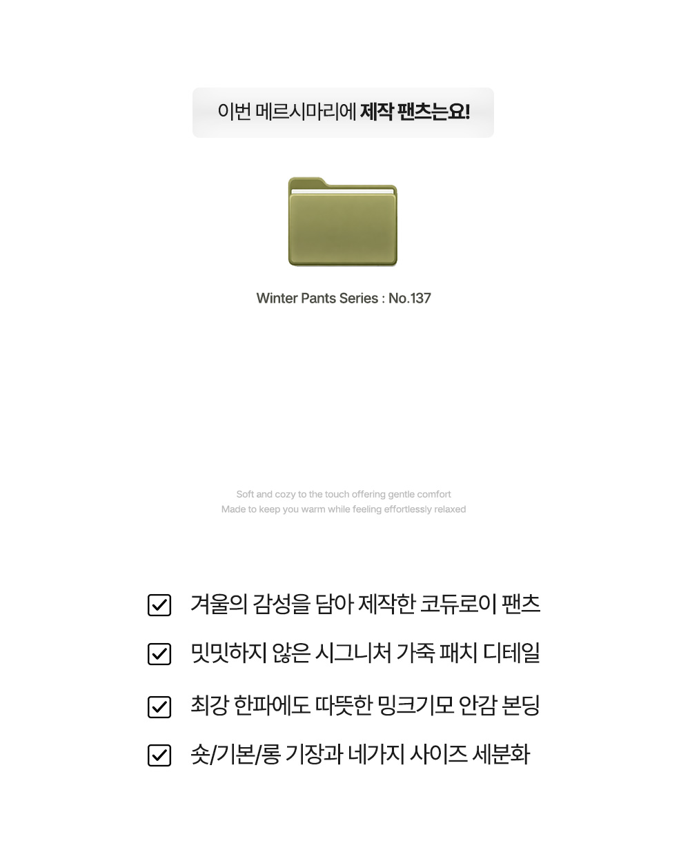 - 밍크 기모 안감이 더해져 한겨울에도 따뜻한 착용감