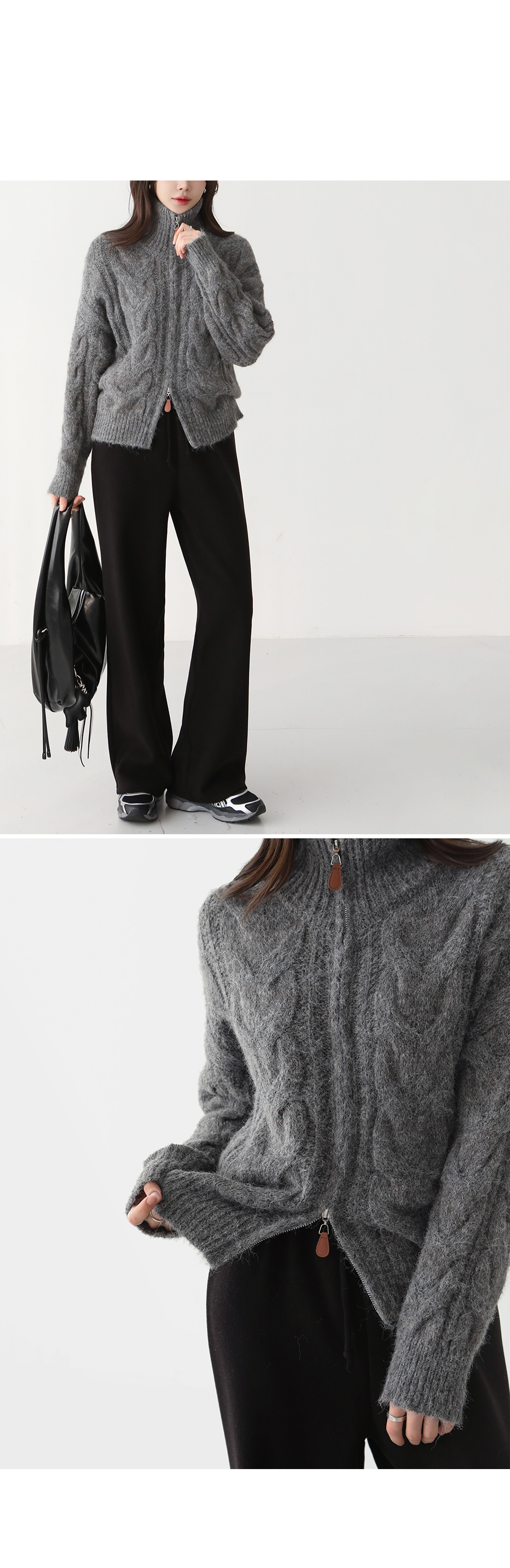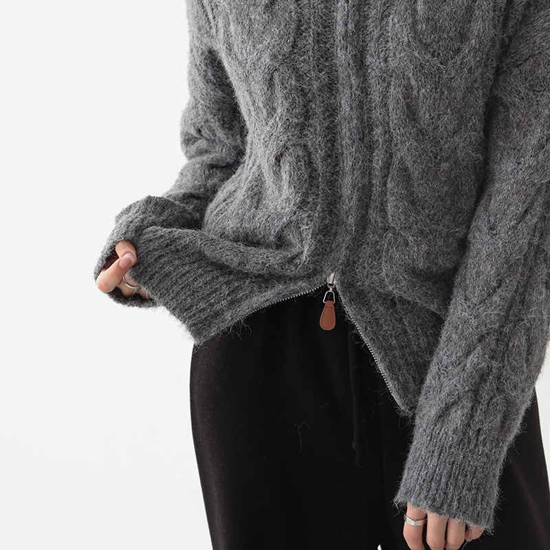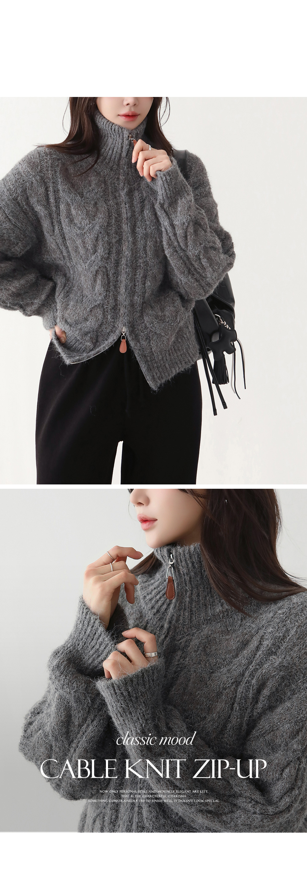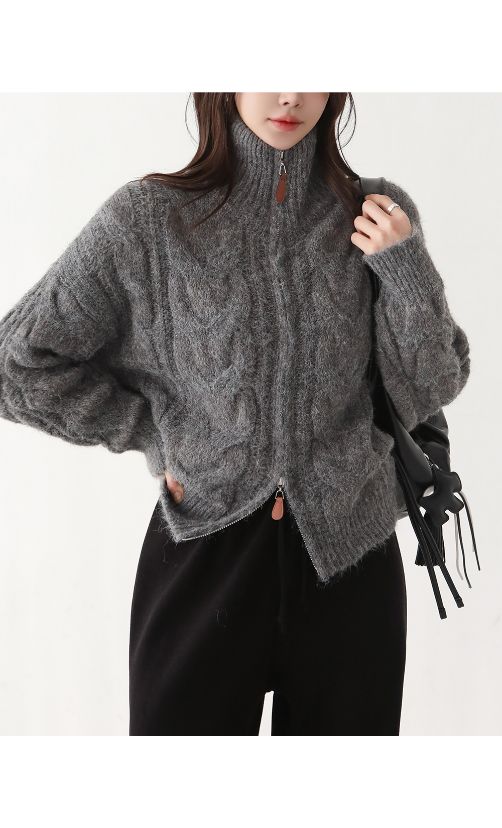 - 클래식한 케이블 조직이 돋보이는 하이넥 니트 아우터