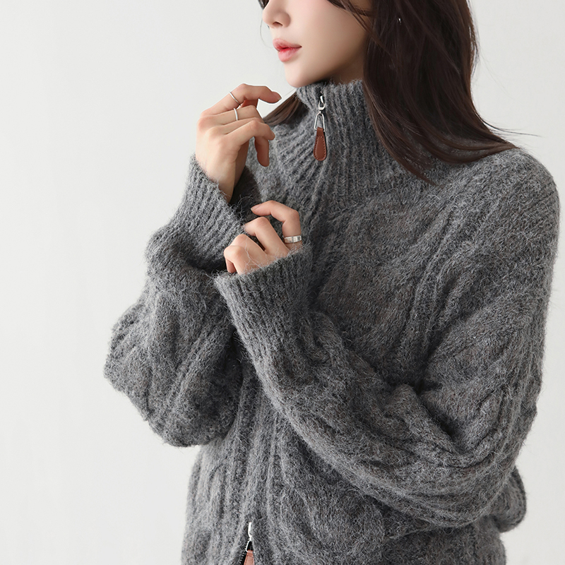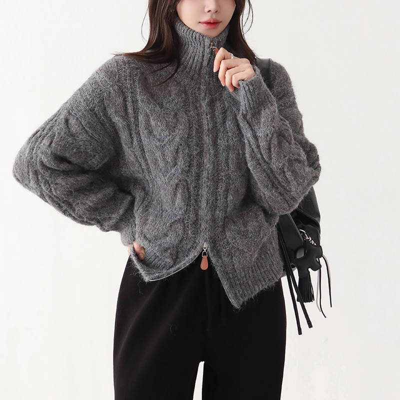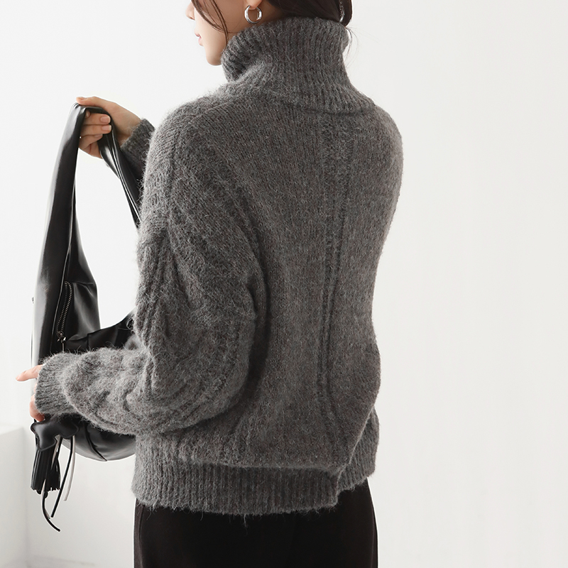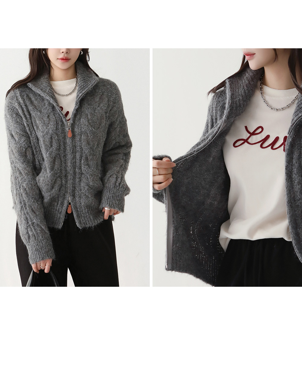 - 클래식한 케이블 조직이 돋보이는 하이넥 니트 아우터