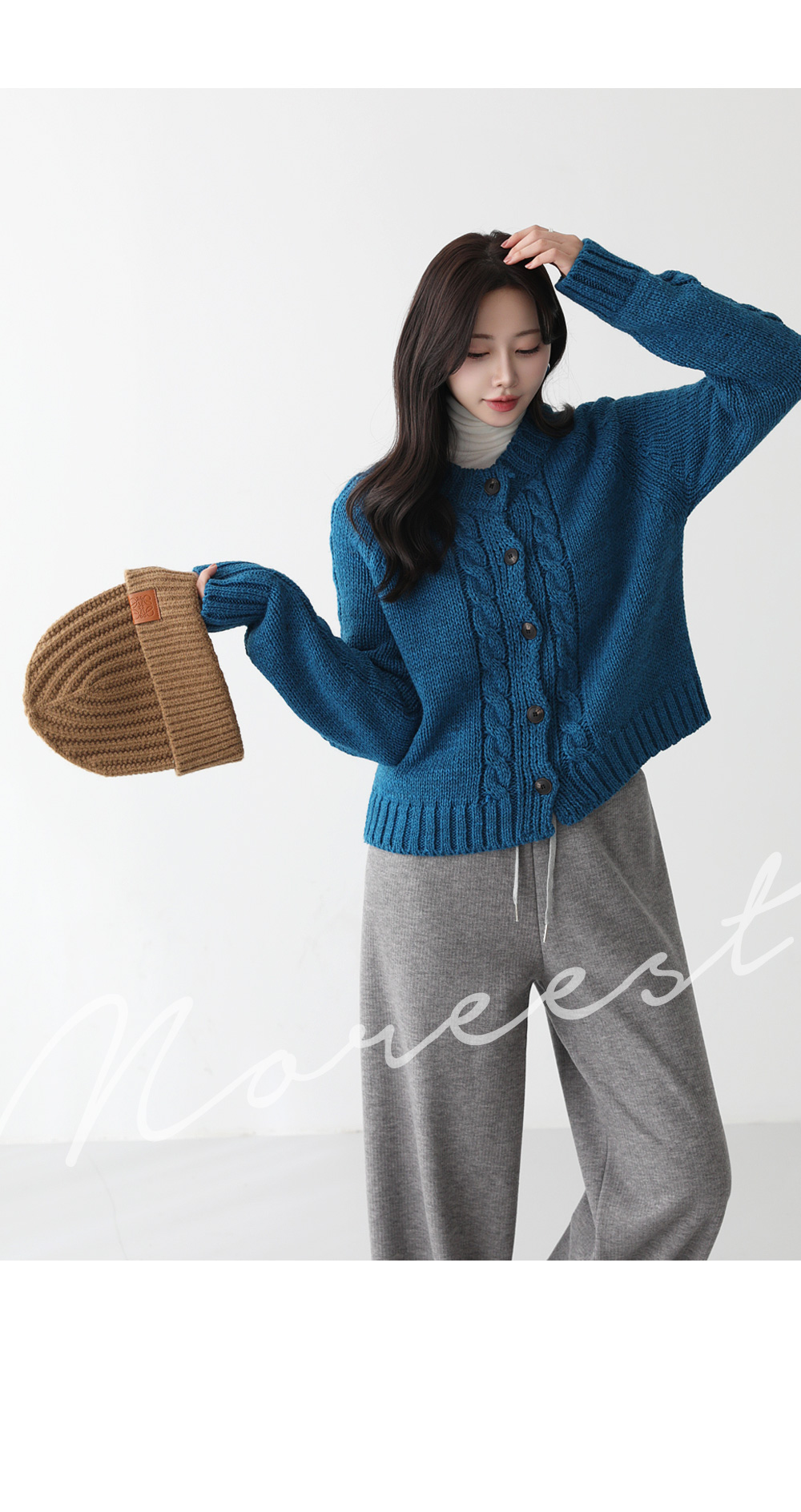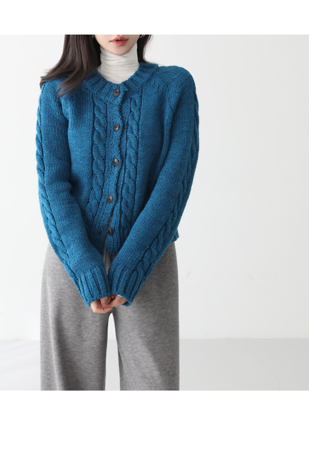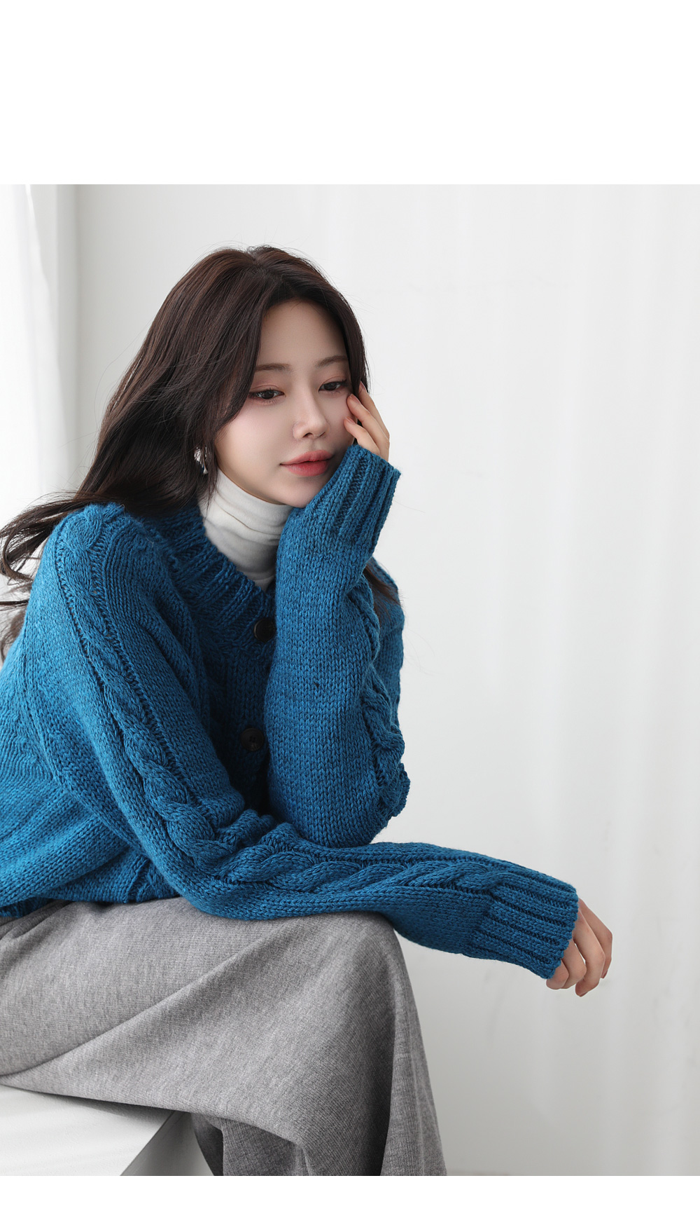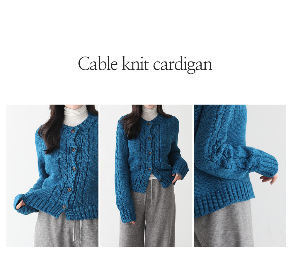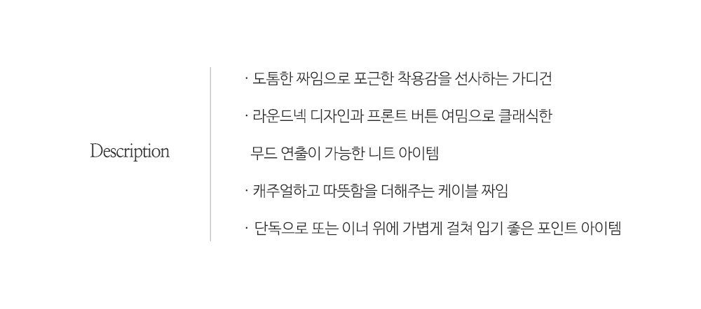 - 도톰한 짜임으로 포근한 착용감을 주며, 세로 꽈배기 패턴으로 포인트를 더한 가디건