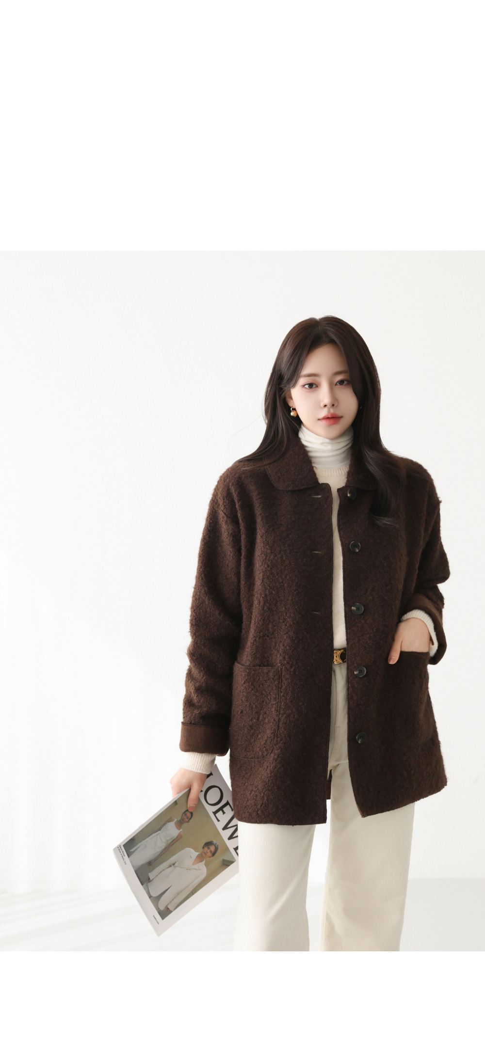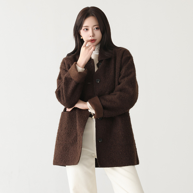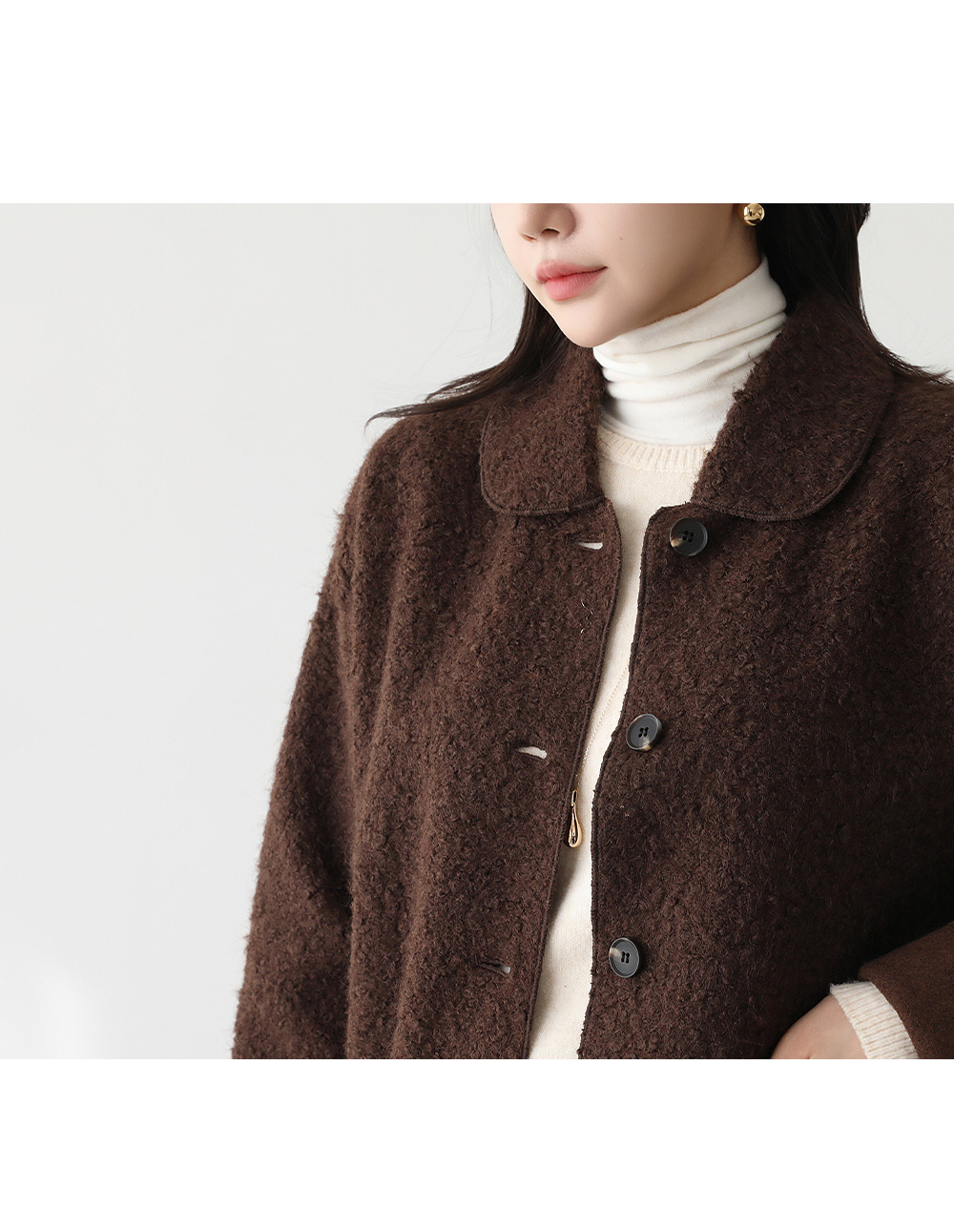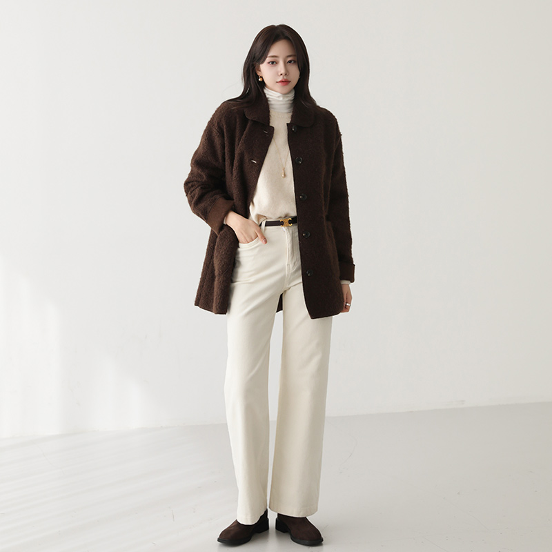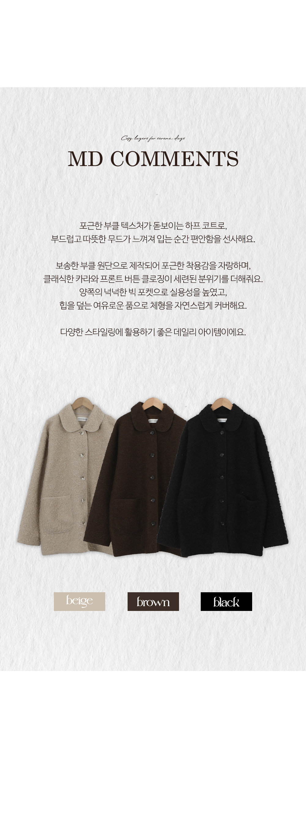 - 포근한 부클 텍스처가 돋보이는 하프 코트로, 따뜻하고 부드러운 무드가 느껴지는 아이템