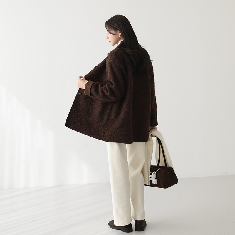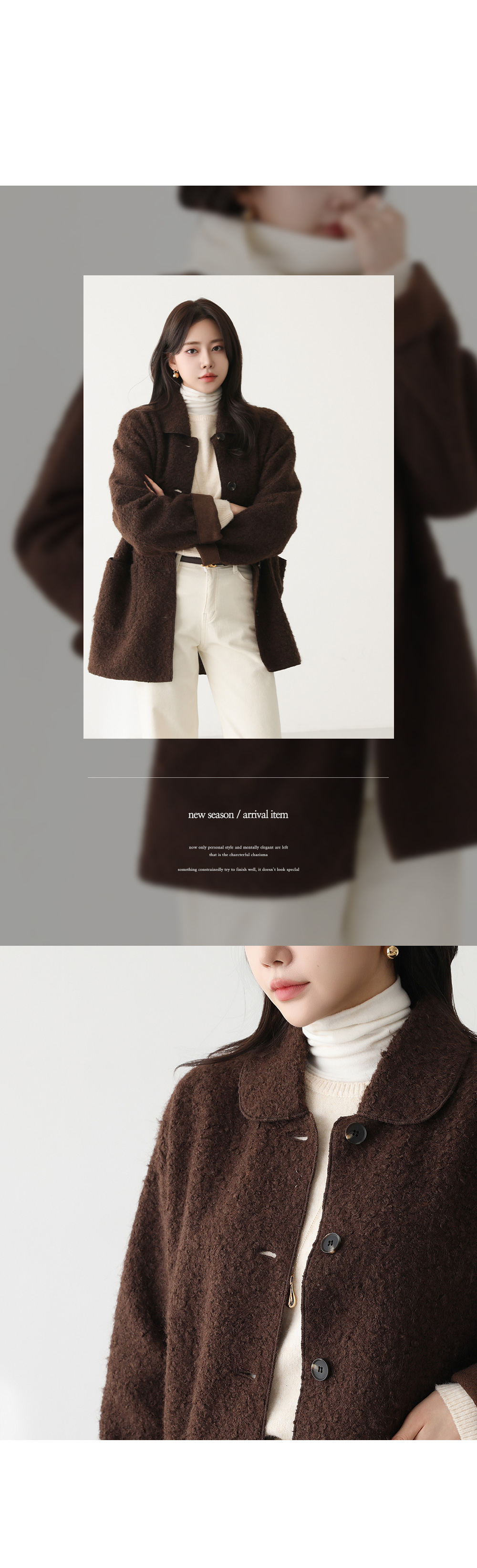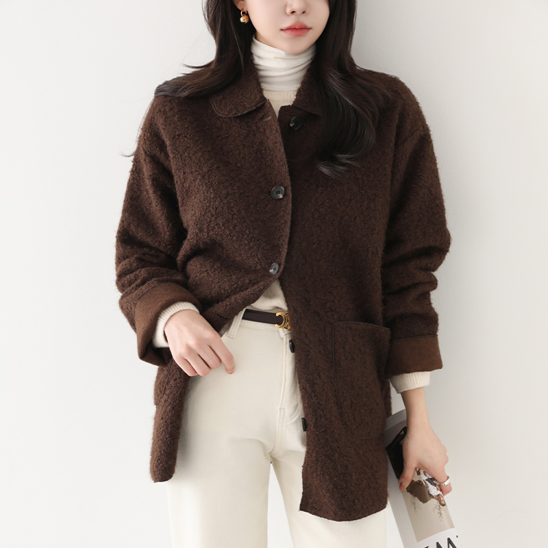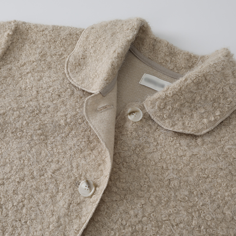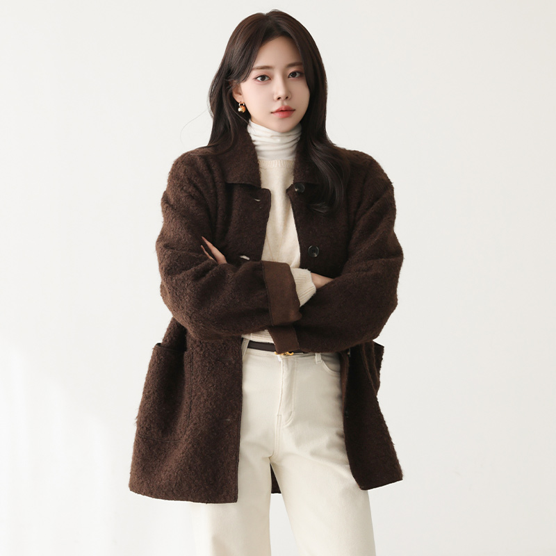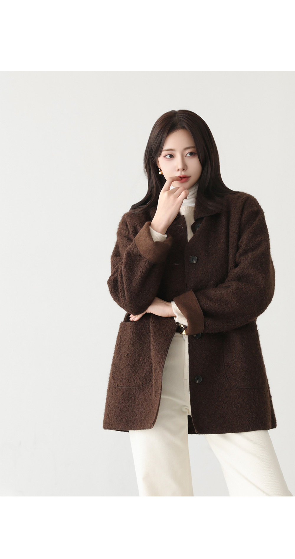 - 포근한 부클 텍스처가 돋보이는 하프 코트로, 따뜻하고 부드러운 무드가 느껴지는 아이템
