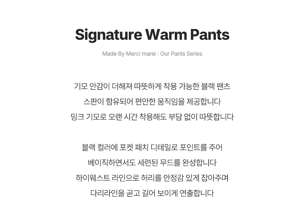 - 포근한 기모 안감이 더해져 겨울철 따뜻하게 착용되는 블랙 팬츠