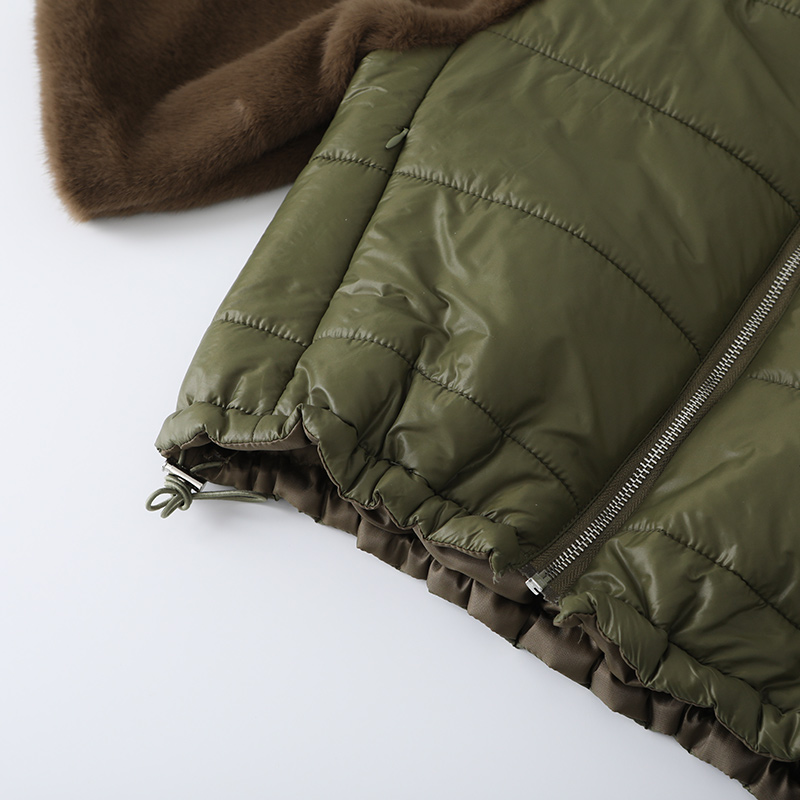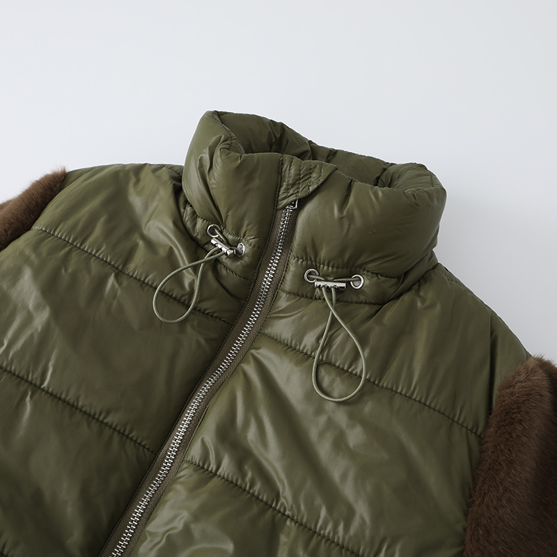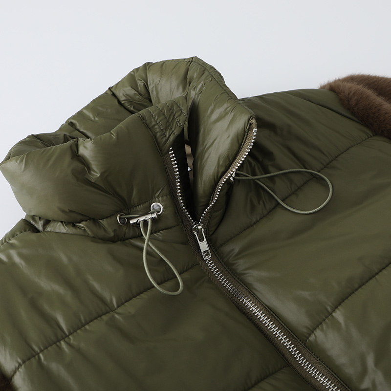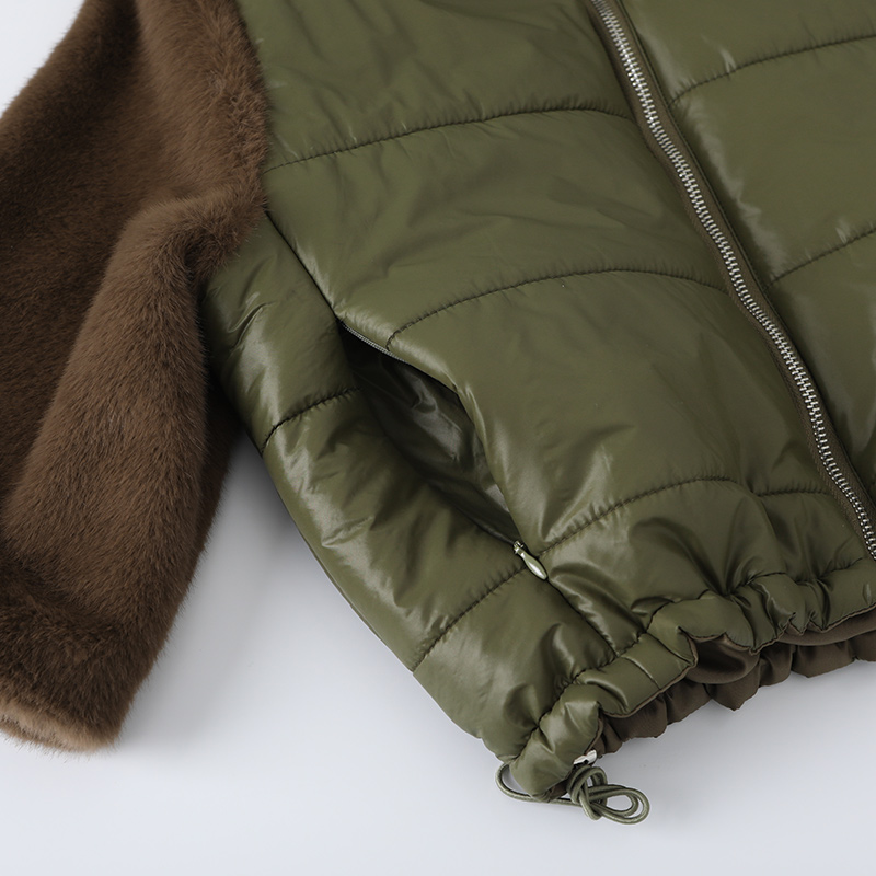 - 은은한 광택의 카키 패딩 바디와 포근한 브라운 퍼 소매가 조화를 이루어 고급스러운 무드를 연출함