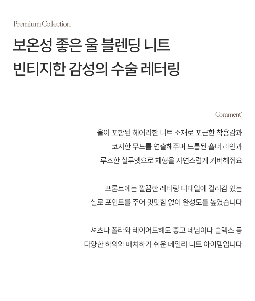 - 울 포함 헤어리한 니트소재로 포근한 착용감은 물론, 코지한 무드 연출