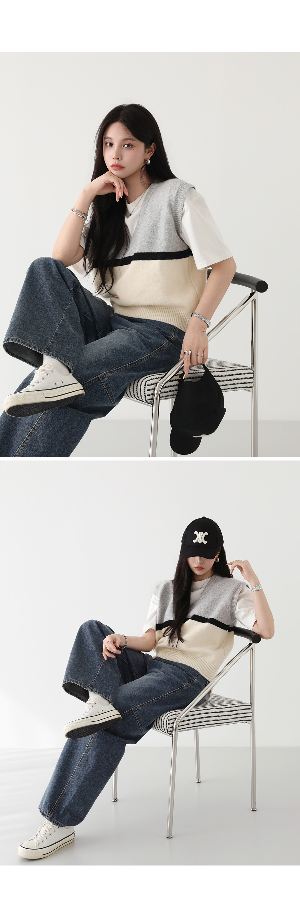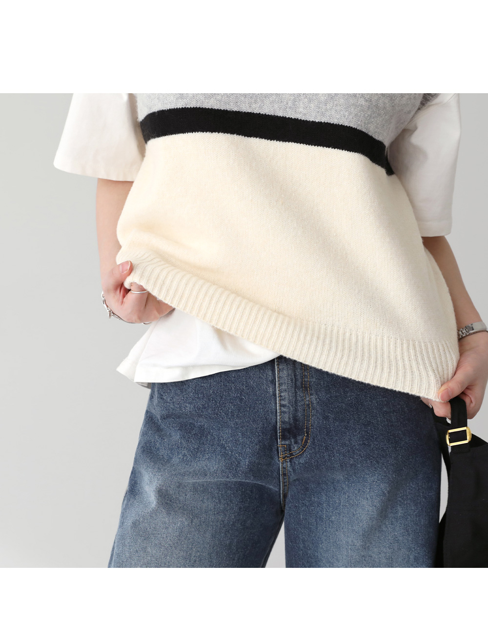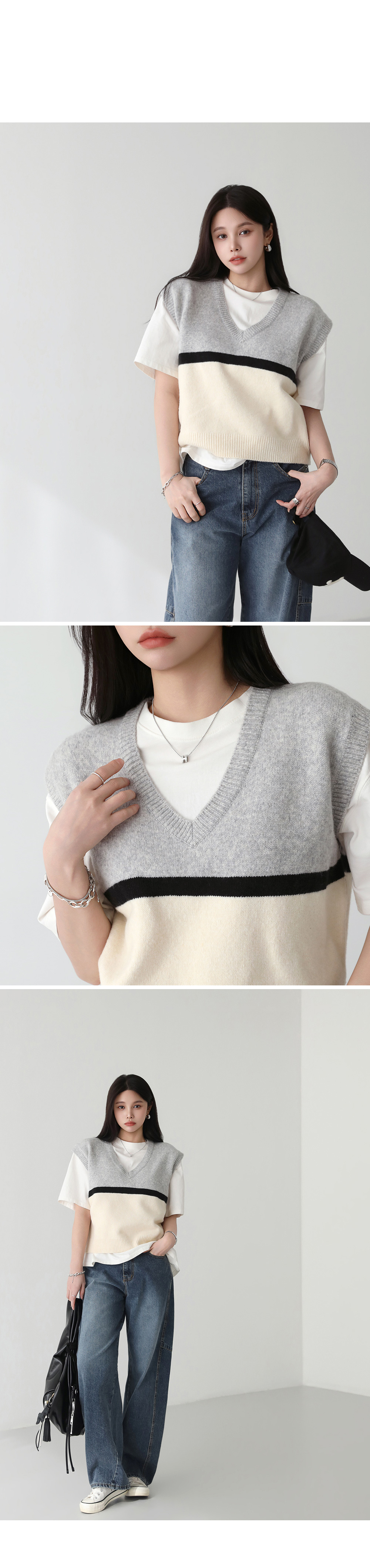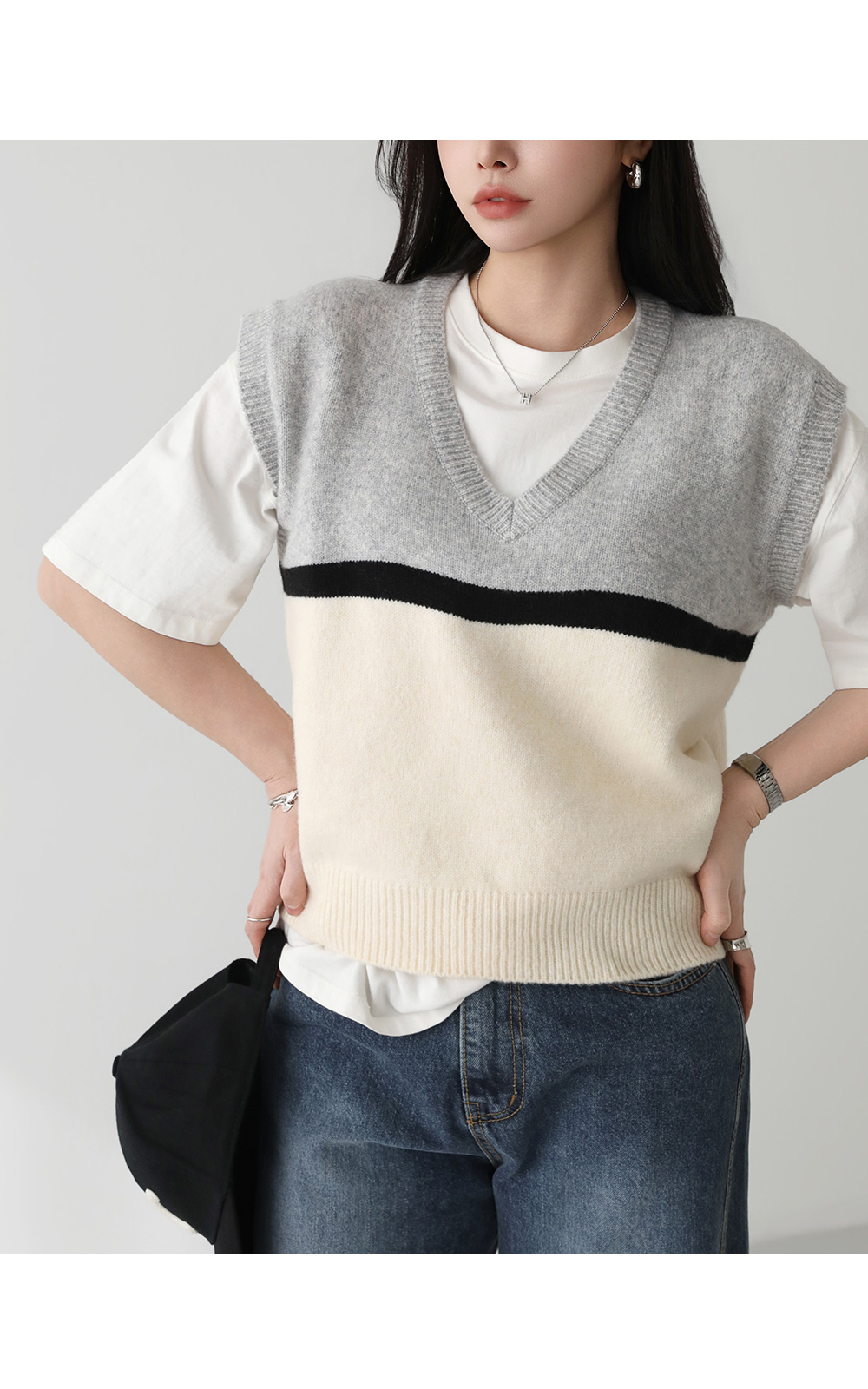 - 3컬러 배색 디자인이 룩에 밋밋하지 않은 포인트를 더해줌