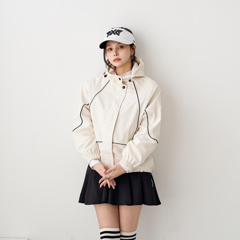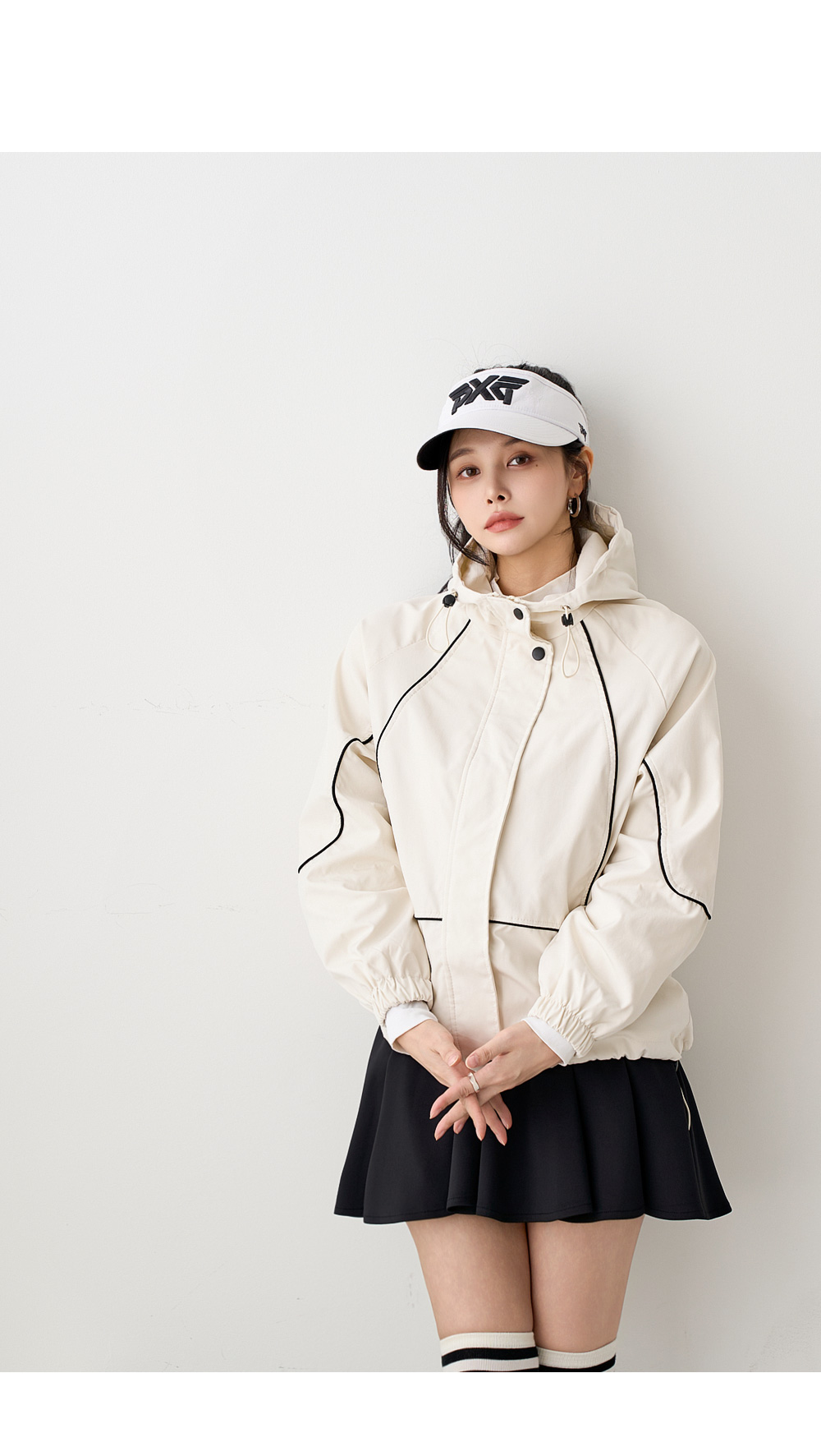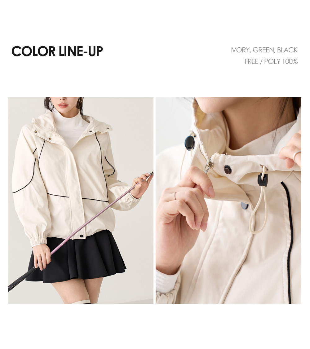 - 하이넥 스타일로 목선을 커버해주며 후드디테일로 캐주얼한 무드