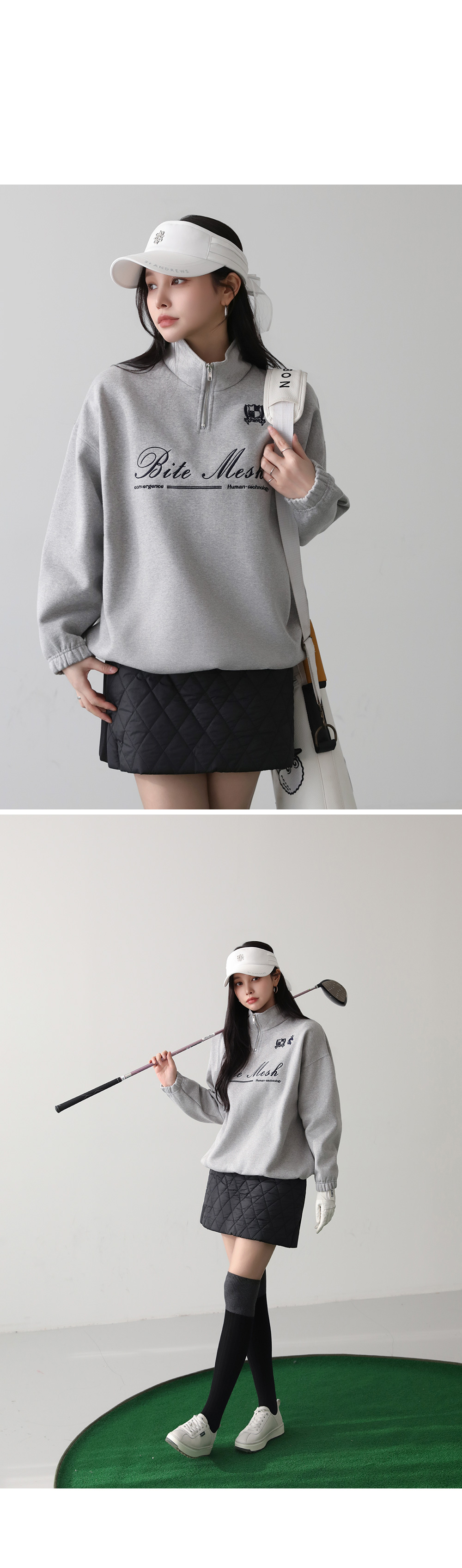- 루즈하게 떨어지는 폼으로 체형커버를 도와주며 밑단 스트링