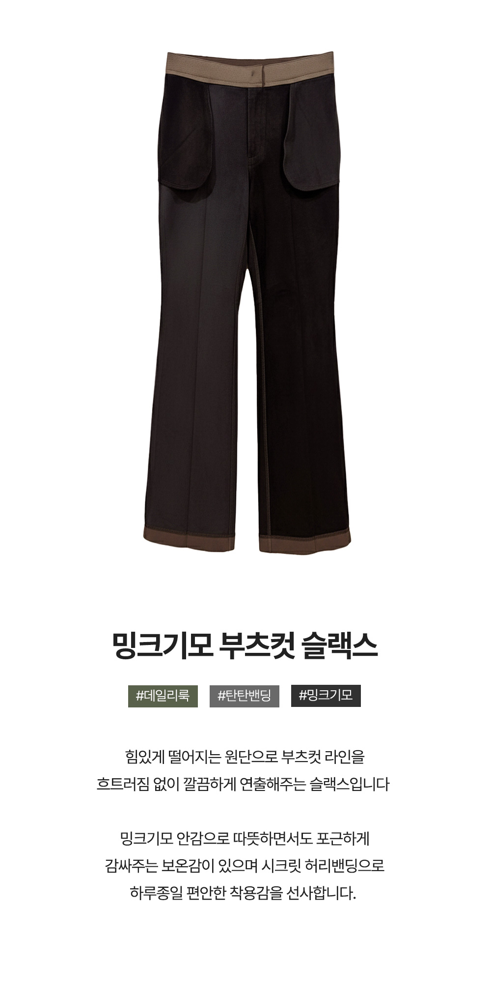 - 밍크 기모 안감으로 따뜻하면서 포근하게 감싸주는 보온감