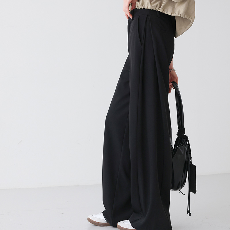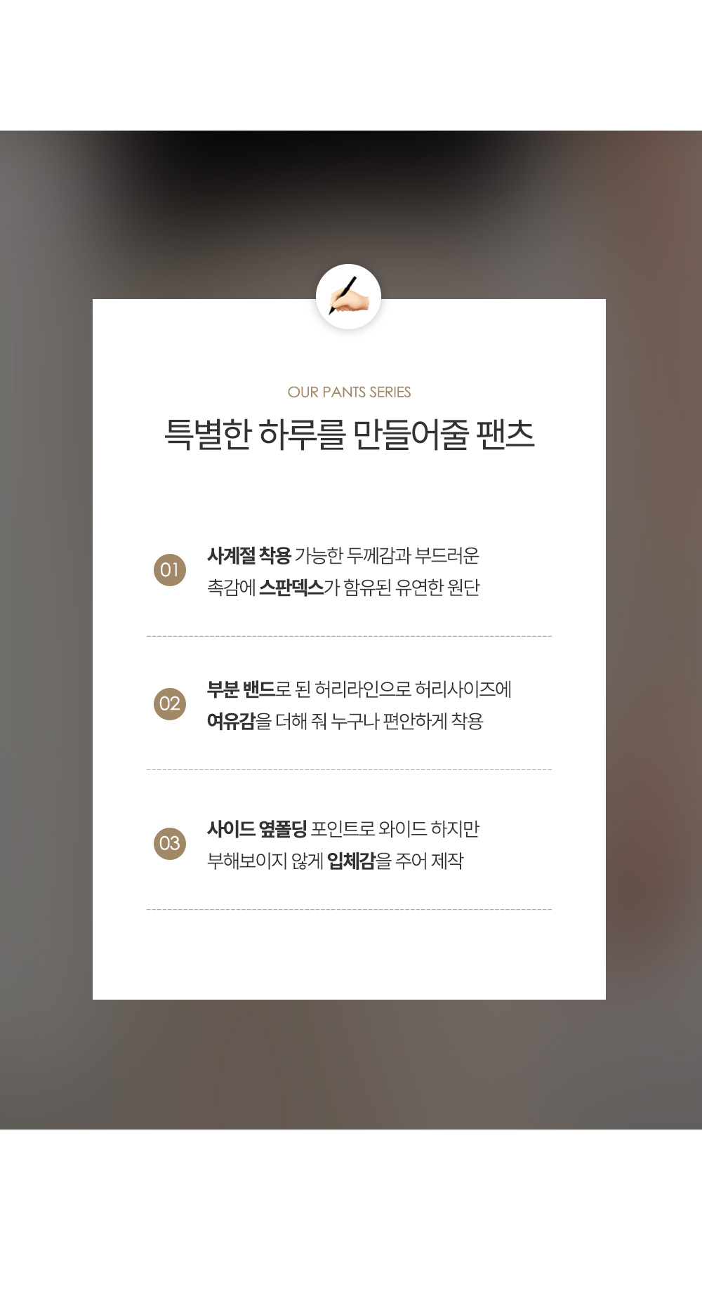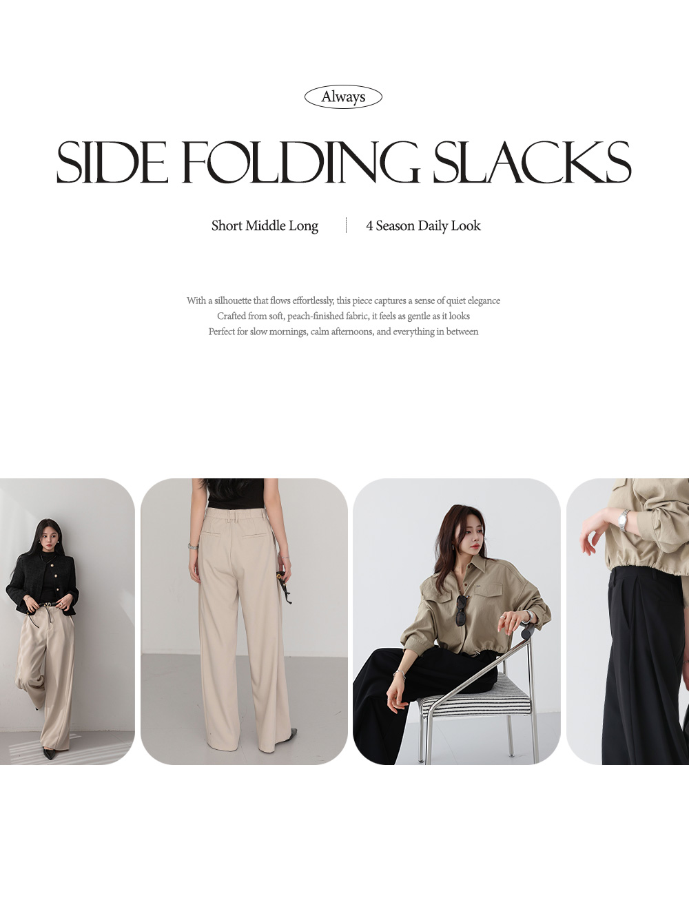 옆 폴딩으로 와이드하지만 부해 보이지 않게 입체감을 주어 미운 하체 군살을 완벽하게 커버해 주는 팬츠입니다.